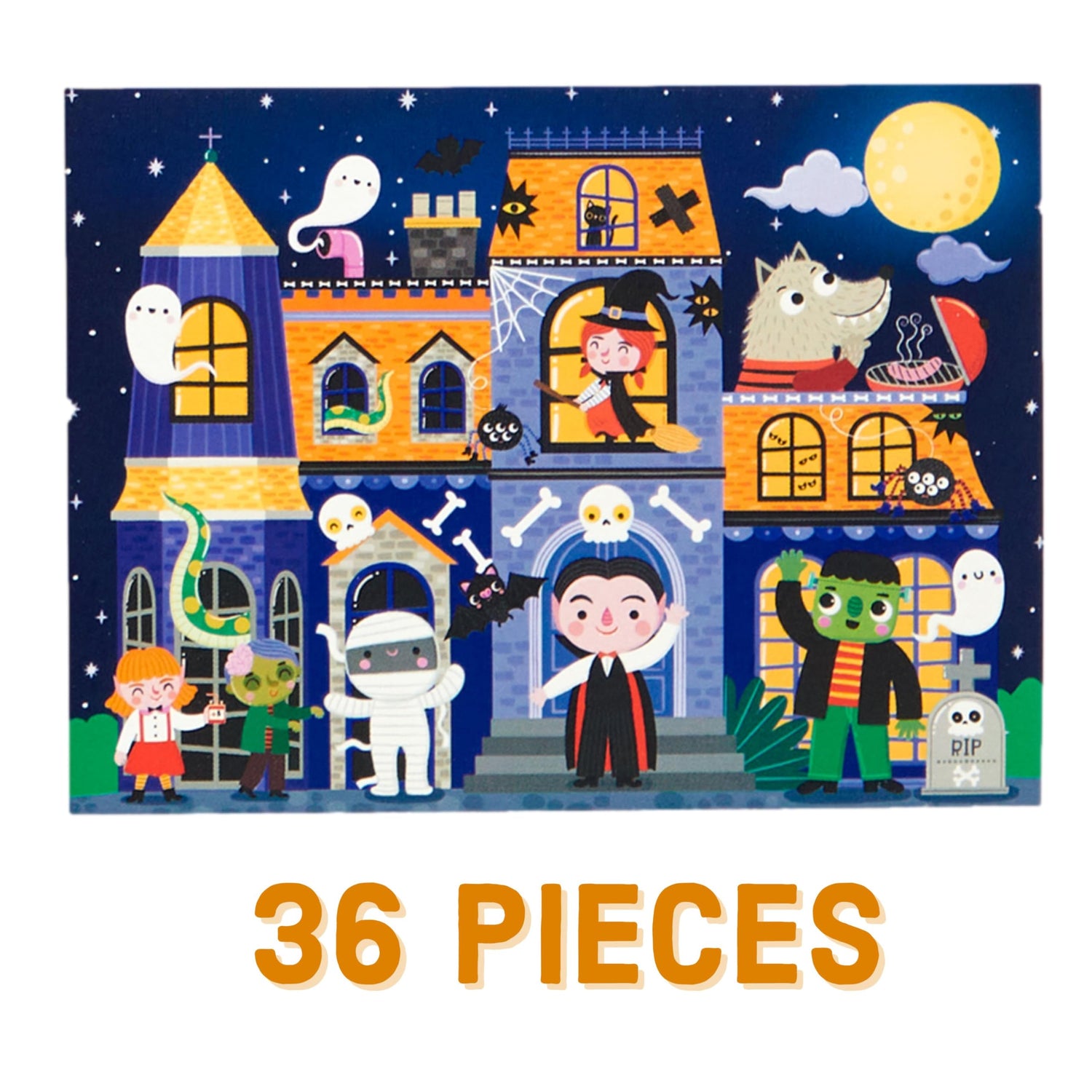 - 👻BRIGHT AND BOLD ARTWORK – This Spooky House puzzle is made up of 36 pieces that fit together to create a colorfully haunted image of your favorite Halloween monsters gathered outside of a haunted mansion enjoying their spooky traditions. Children will have a great time putting together the images of these adorable ghouls!