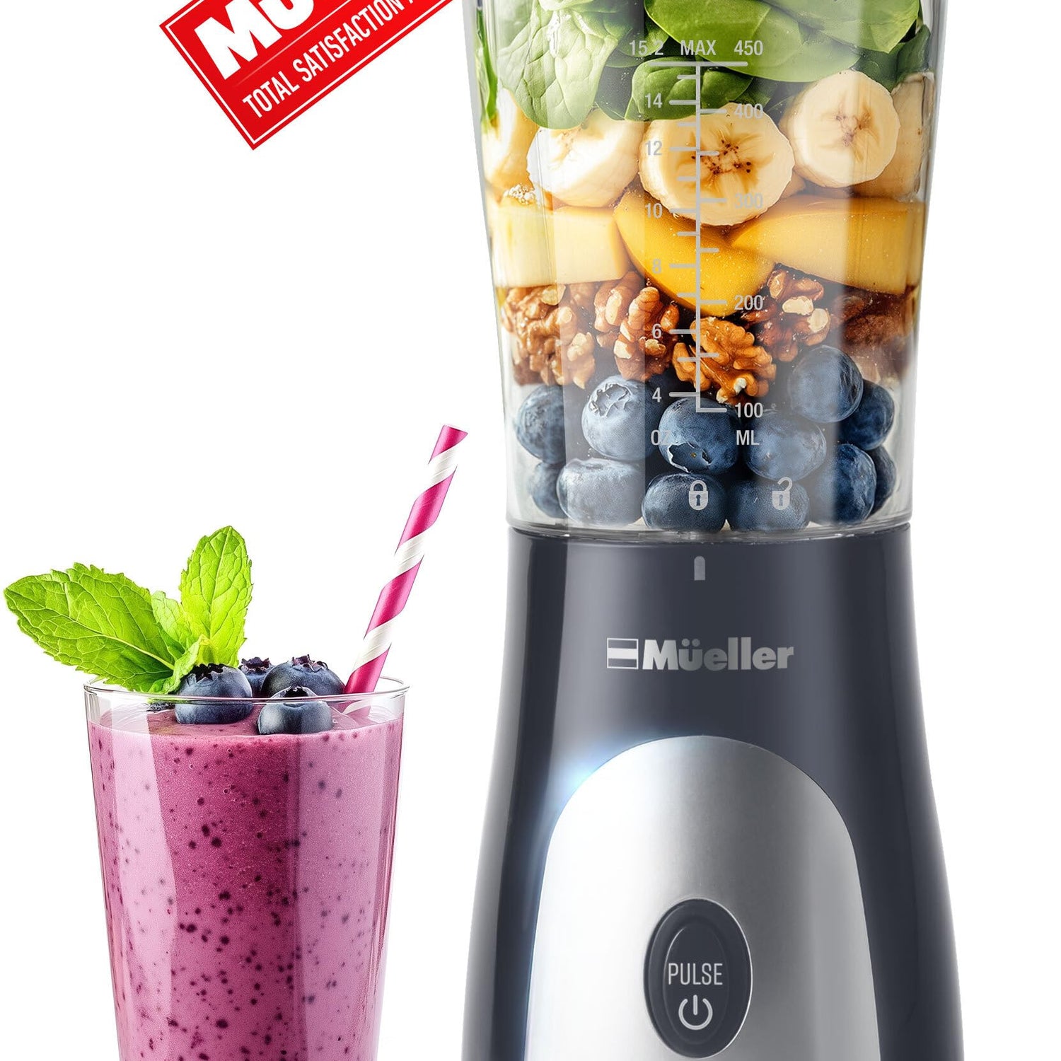 Mueller Heavy-Duty Smootie Blender, Personal Blender for Shakes and Smoothies with a 15 Oz Travel Cup and Lid, Juices, Baby Food, Portable Blender & Food Processor, Light Grey