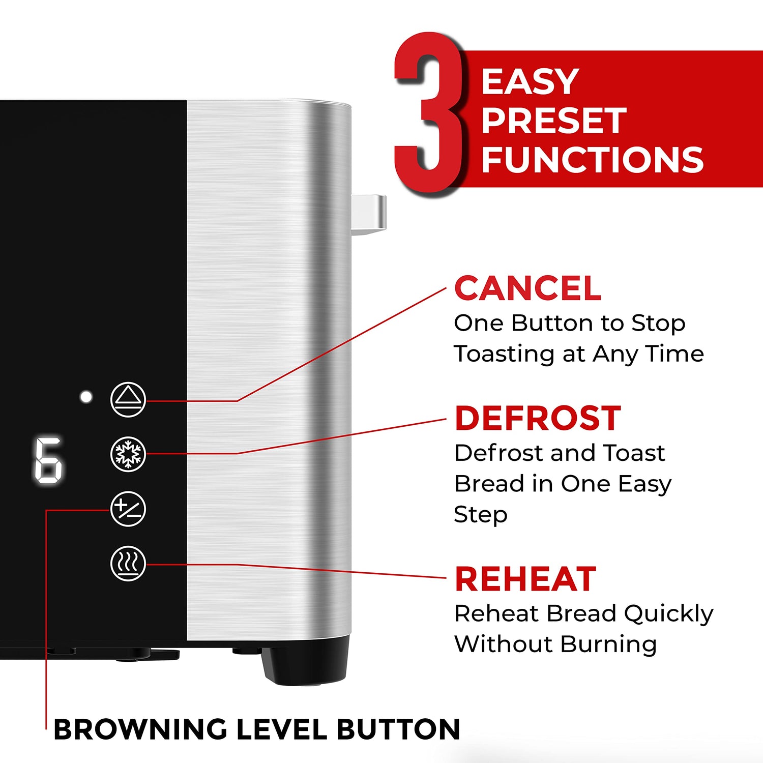 - Full Control – Six browning settings let you take control of your toasting level so you can enjoy your toast exactly how you like it. Memory recall keeps your settings saved, but with sleek touch buttons and LED display, it’s just as easy to switch between settings.