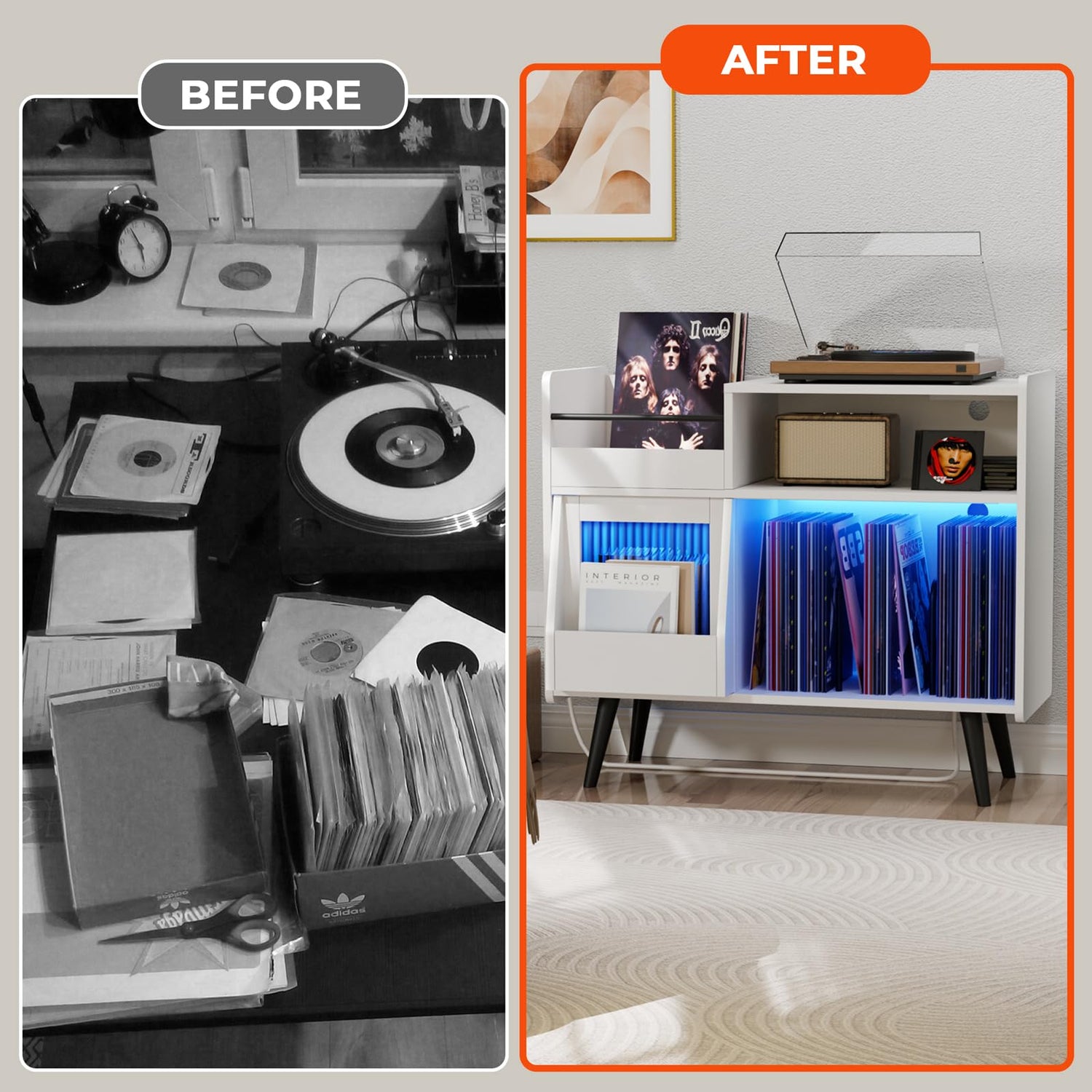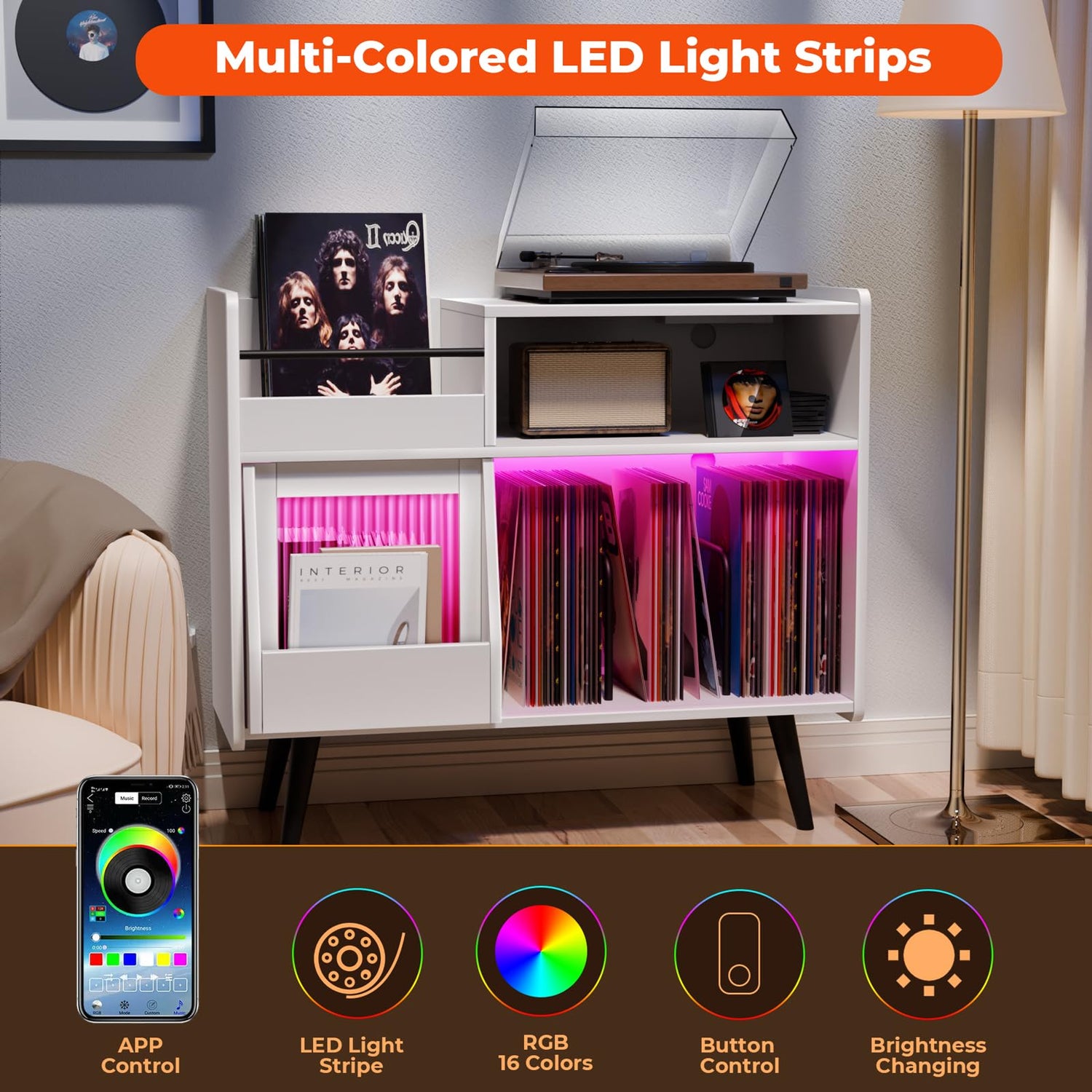 MULEJYBO Large White Record Player Stand with Sliding Door,350 Vinyl Record Storage Cabinet, Record Player Table with Power Outlet and LED Light,Turntable Stand with Wood Legs for Living Room,Office