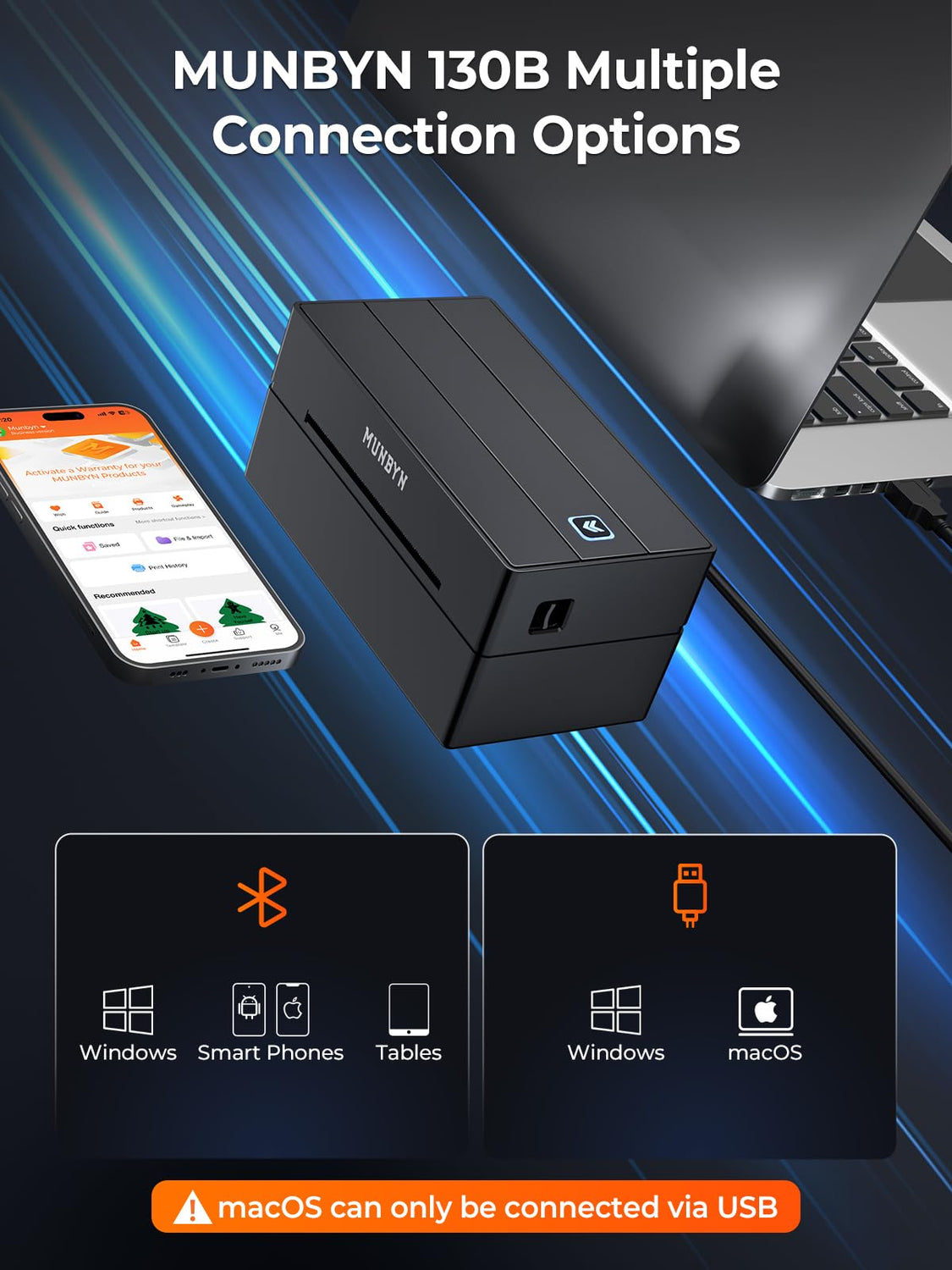 - Effortless Thermal Printer: Enjoy a quick 3-step setup—connect, design, and print. Seamlessly link via Bluetooth on iOS, Android, and Windows using the 'MUNBYN Print' app and Munbyn PC Editor with design function enabled. For macOS and desktops without Bluetooth, connect via USB. Compatible with major online and shipping platforms(**Note:** For customers using Windows on Arm (WoA) systems, we recommend using our online tool, MUNBYN Editor, to edit and print label files)