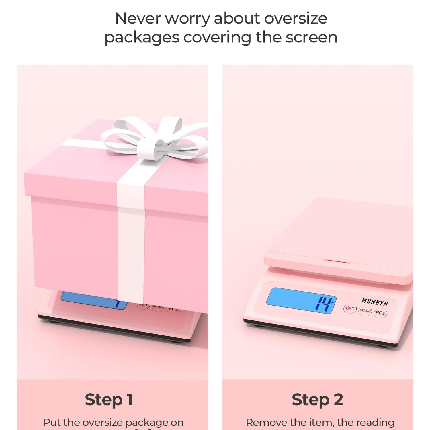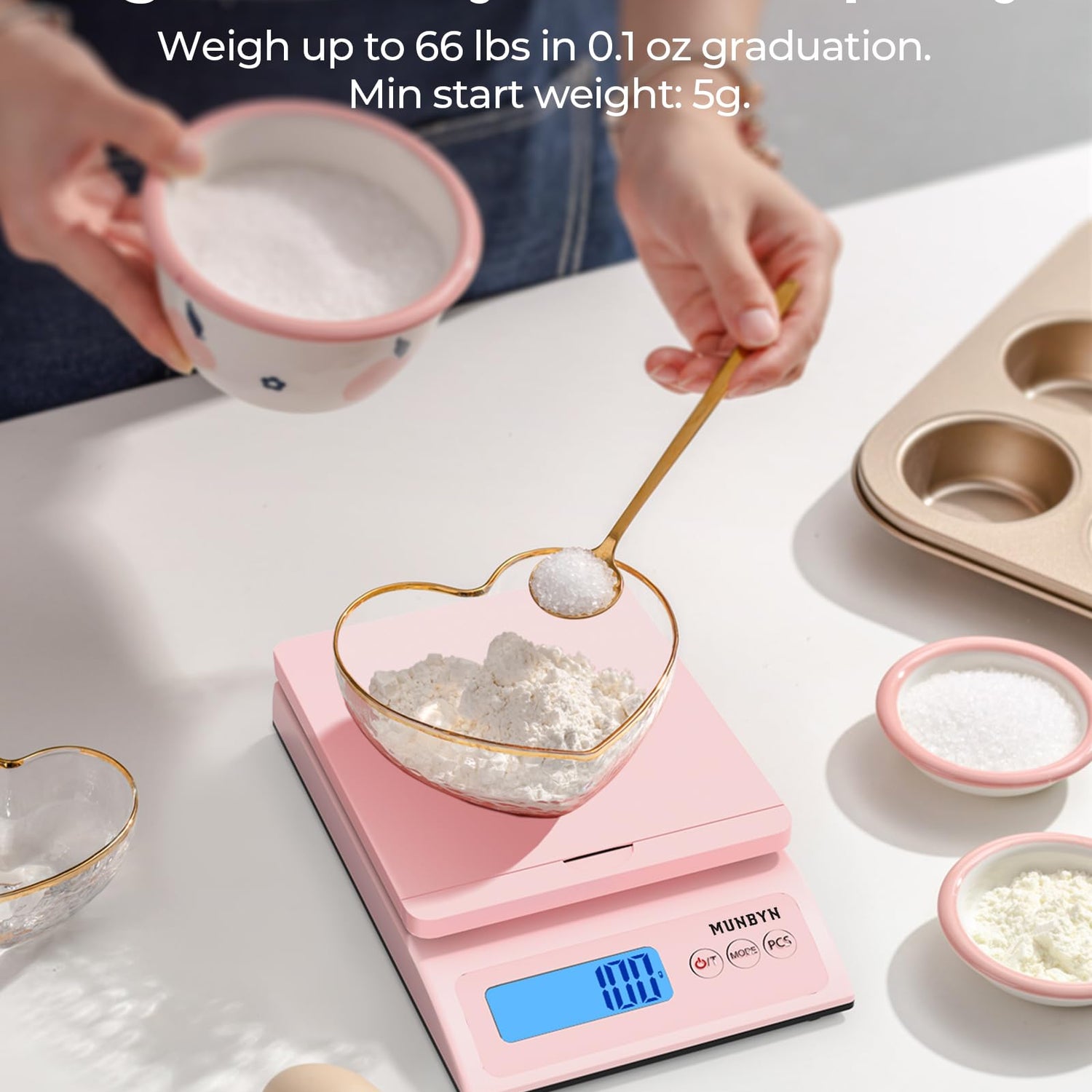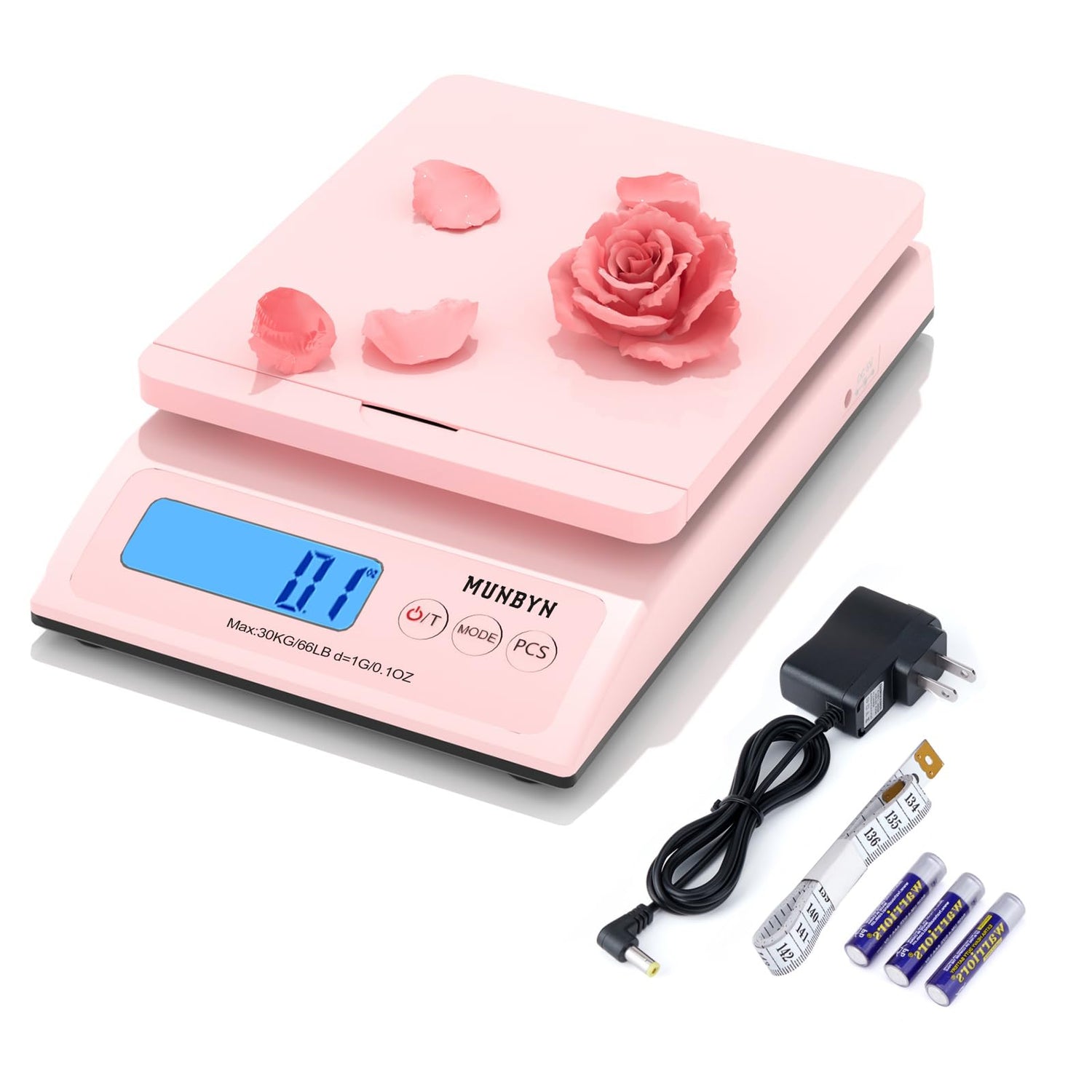 MUNBYN Shipping Scale, Accurate 66lb/0.1oz Postal Scale with Sweet Pink Style, Hold/Tear/PCS Function, Auto-Off, Battery & AC Adapter, Back-Lit LCD Display, Digital Scale for Packages and Food Pink