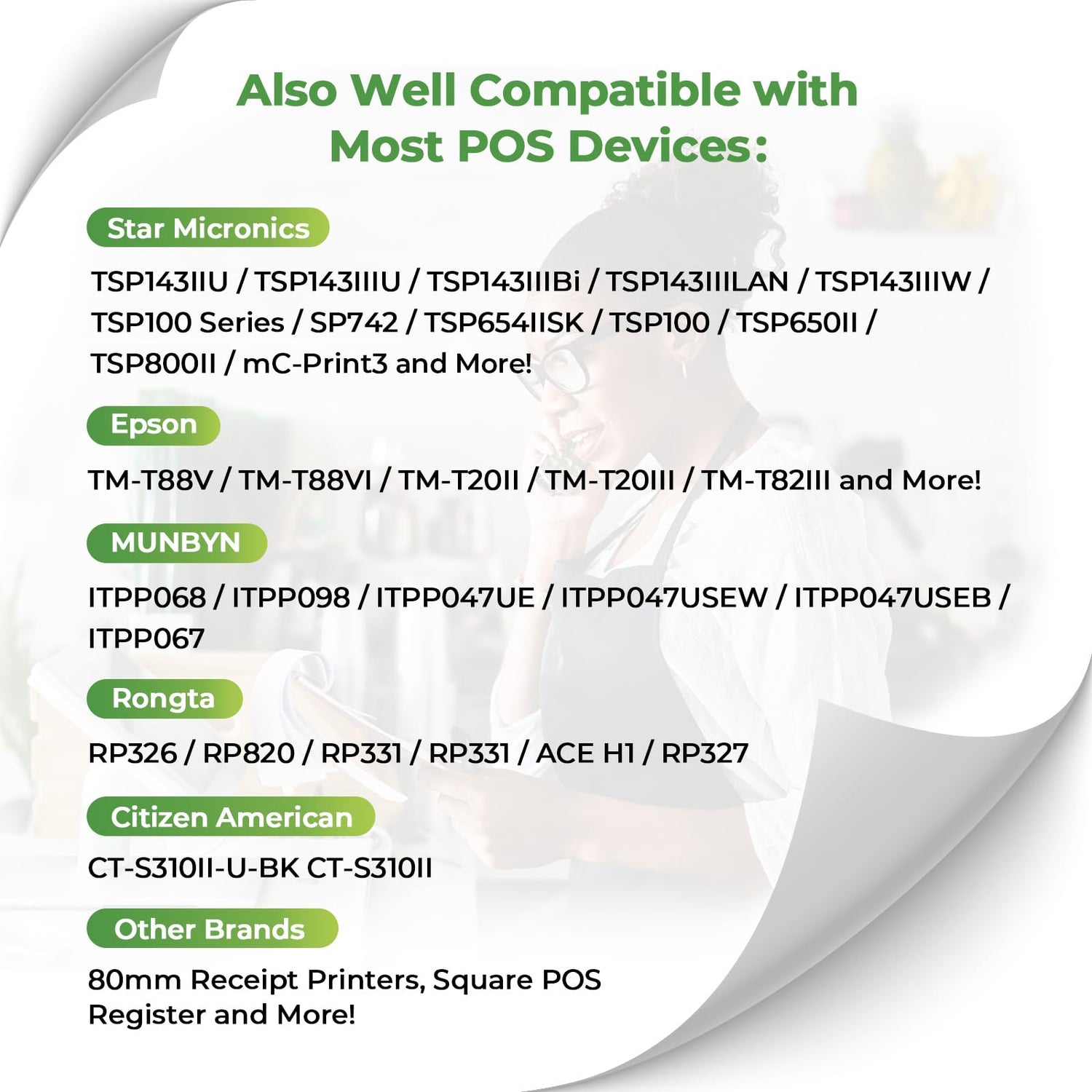 - [Wider Compatibility] 3 1/8 x 230 thermal receipt paper fits all common POS cash register thermal printers. Its roll size fits most POS systems and desktop 80mm thermal receipt printers, compatible with a wide range of brands and models. No need to worry about getting the wrong paper