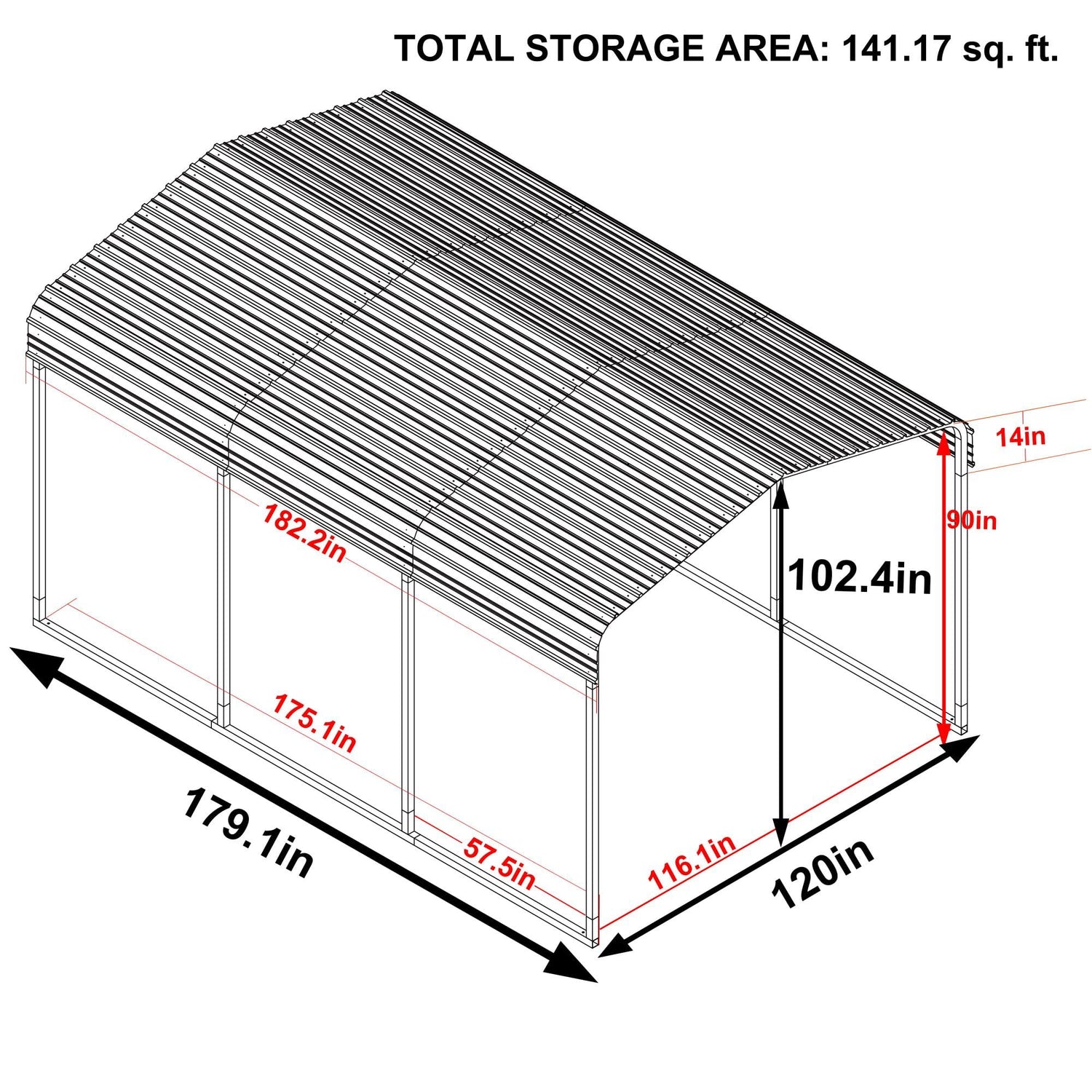 - DIMENSIONS: Overall size: 120"W x 179.1"D x 102.4"H. Interior size: 116.1"W x 175.1"D x 102.4"H. The 4 anchor bolts are included for further stabilization. Note that our products will be divided into 4 packages, which might not arrive at the same time. Please make sure you are permitted to build a carport from your local before purchase.