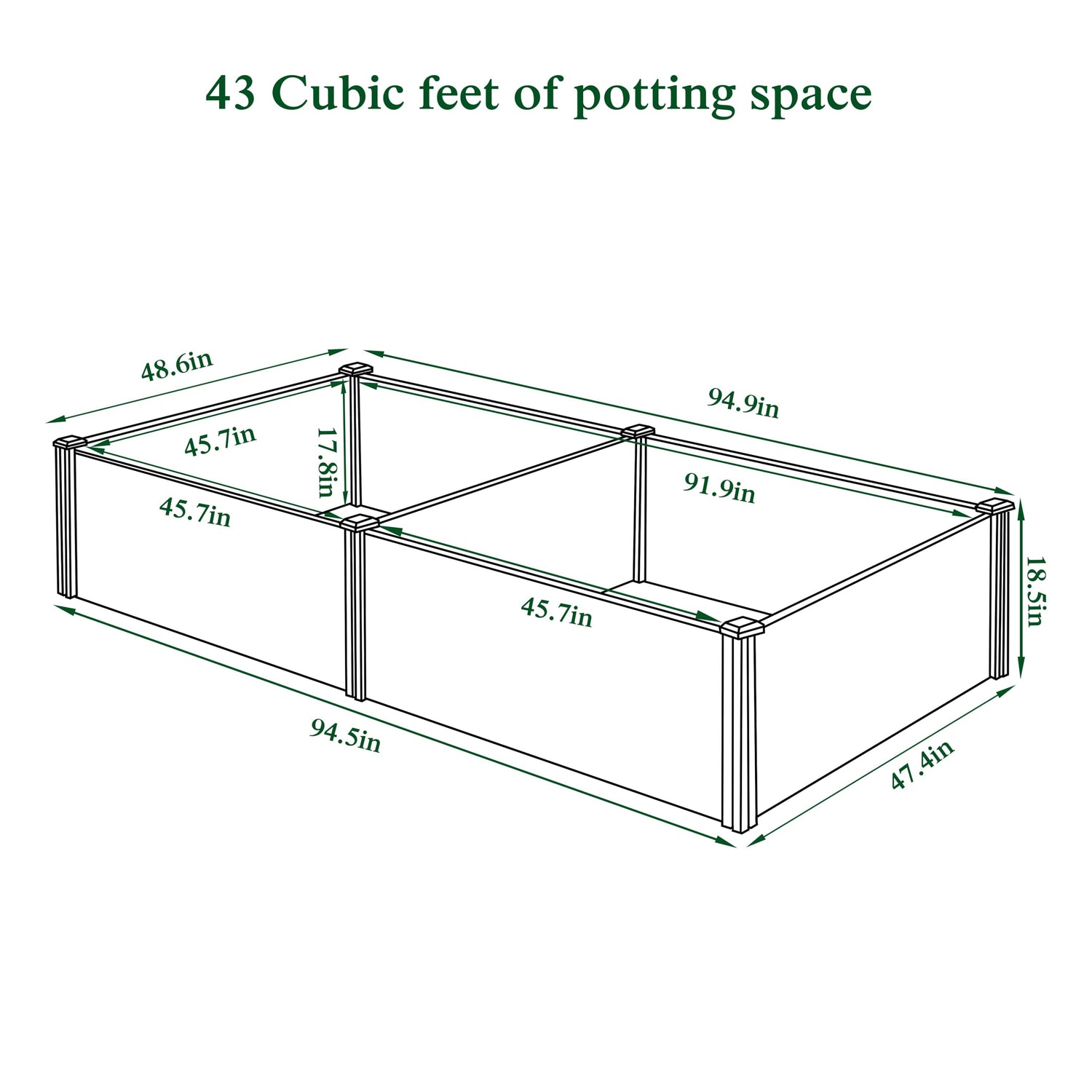 - GENEROUS PLANTING SPACE - The wooden raised bed features two spacious planting boxes, with interior dimensions of 91.9" L x 45.7" W x 17.8" H, offering plenty of room to grow a wide variety of plants—including flowers, herbs, vegetables, and fruits. With a total capacity of 43 cubic feet, you can prepare the appropriate amount of soil based on this volume.