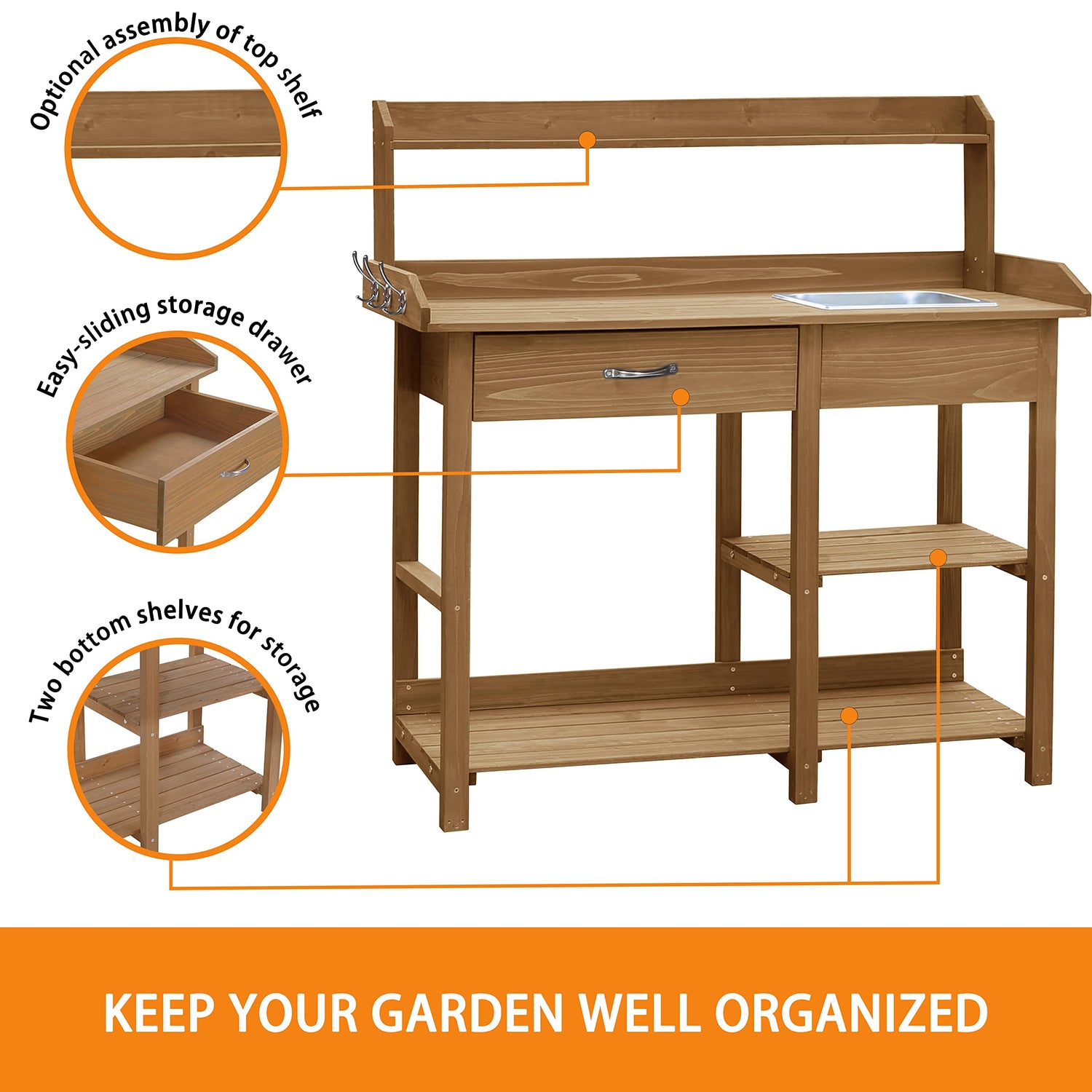 - 【PRACTICAL AND FUNCTIONAL】This garden bench is functional and easy to use with spacious storage shelves, large tabletop with removable stainless sink, extra shelf above the table for placing small tools or flower pots, one drawer and three stainless hooks on the one side of the bench for hanging tools such as small shovels. This potting bench is really an easy piece to assemble.