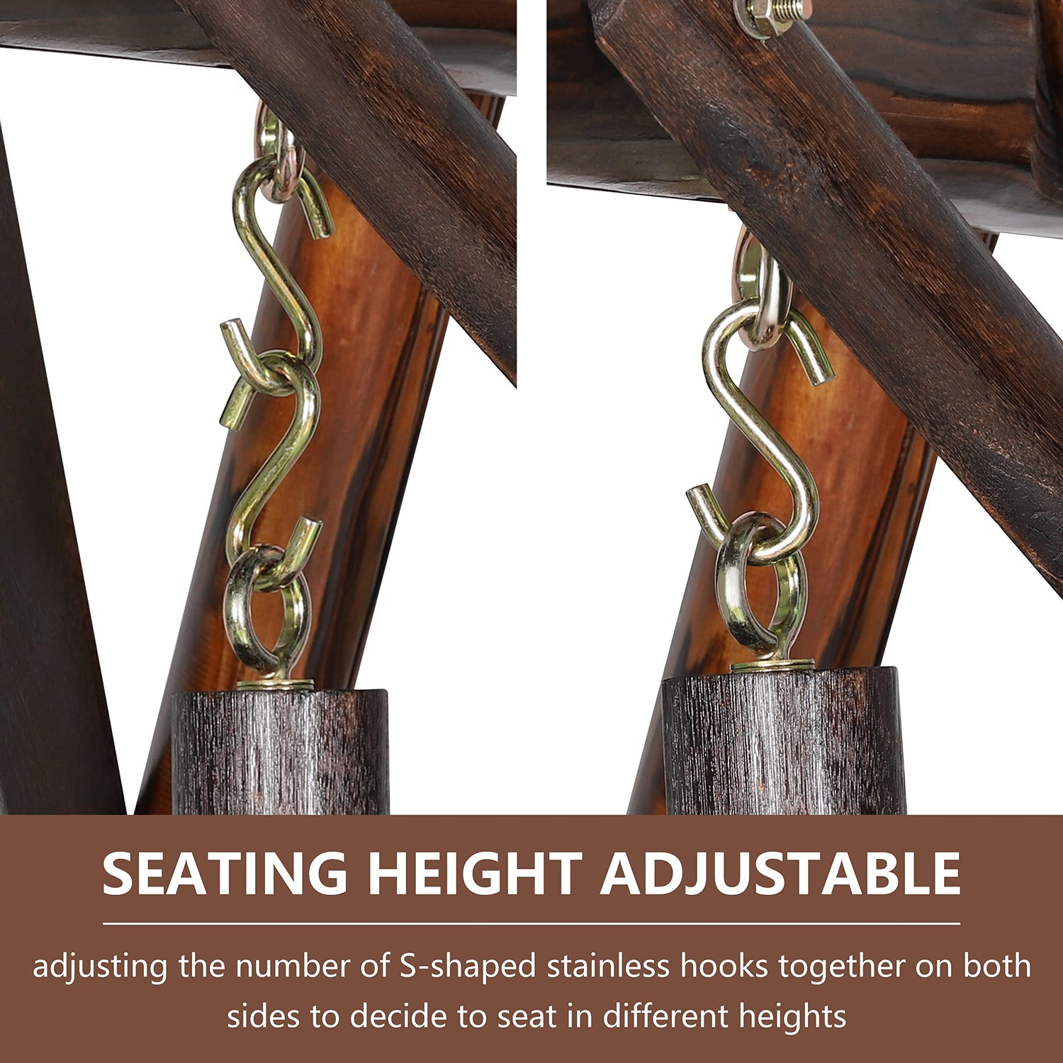 - 【2-IN-1 WOODEN PATIO SWING COMBO】This wooden patio swing outdoor includes the solid wood log A-frame, solid fir wood loveseat bench chair to seat two people, metal hooks for hanging, and all necessary hardware. There is no need for you to buy them separately, which is a waste of your time and your money. Assembling this outdoor wooden swing with stand is not a tough one with detailed instruction and necessary hardware included. Daily maintenance is easy, too. Just wipe it with a cloth.