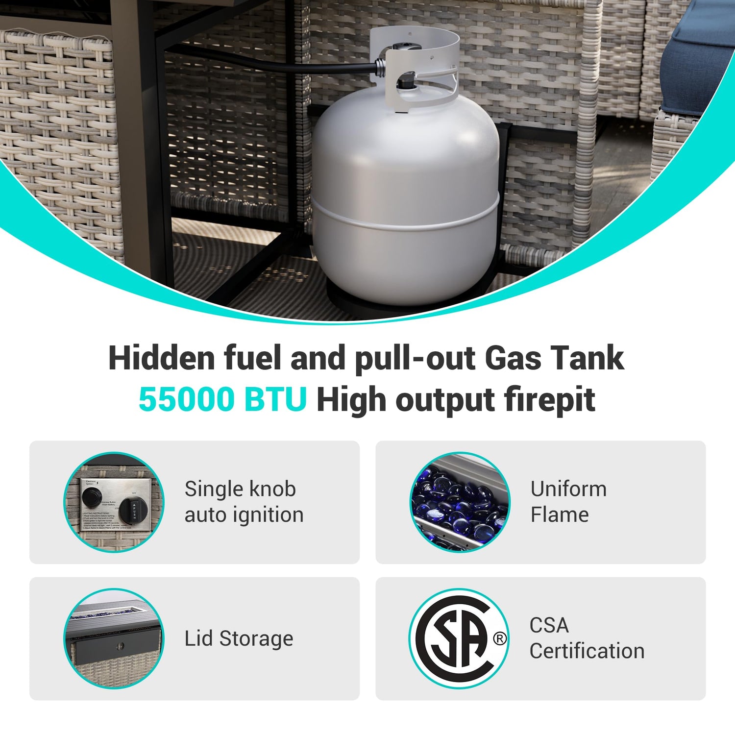 - Easy Assembly & Clean: This rattan set is designed for hassle-free setup and upkeep. The modular pieces assemble quickly, and the rattan material is easy to clean—just wipe with a damp cloth. The fire pit table is compatible with standard propane tanks (not included) for convenient use