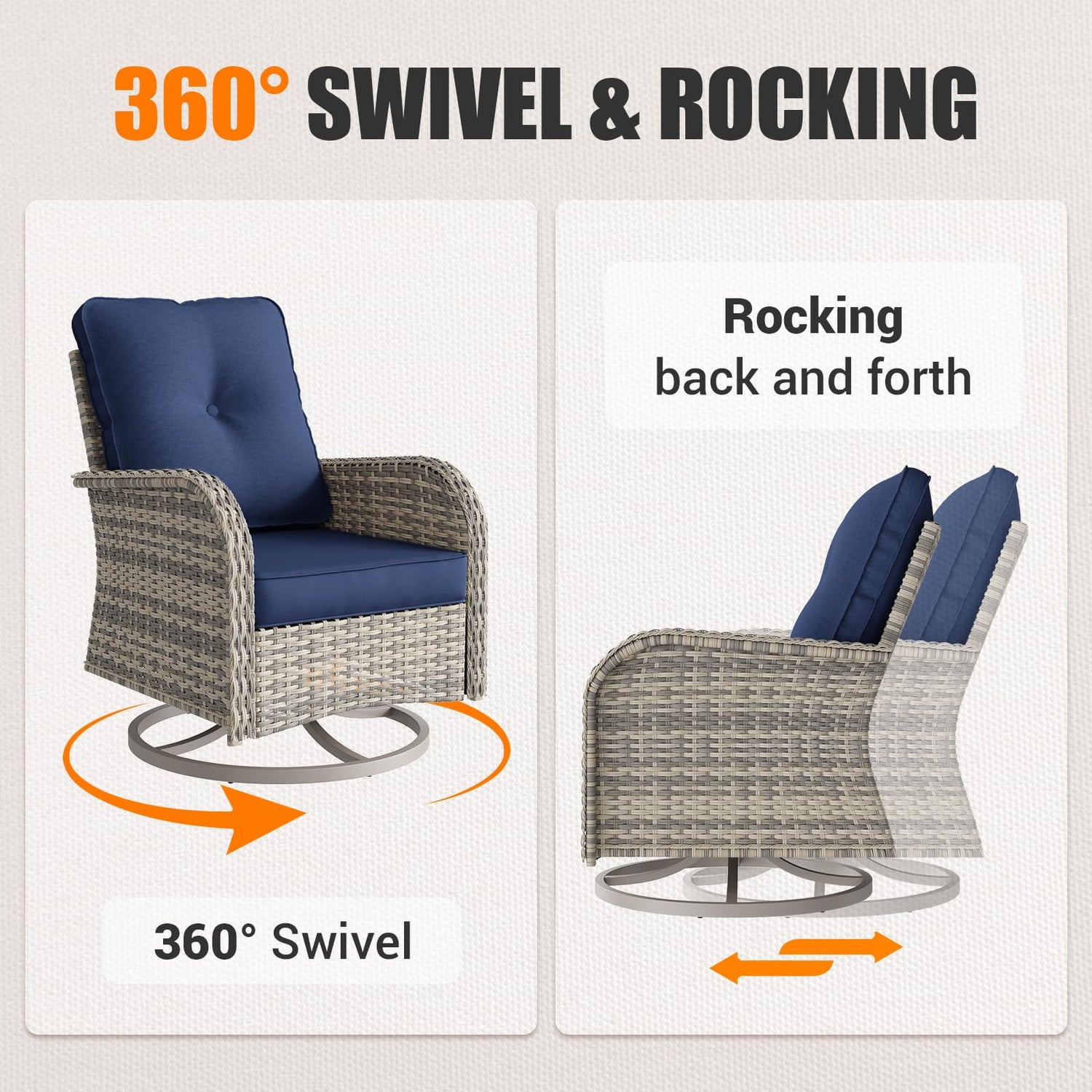 Muphyers 13-Piece Outdoor Patio Furniture Set with Rocking Swivel Chair, PE Wicker Rattan Sectional Sofa Patio Conversation Set with 55,000 BTU Fire Pit Table & Coffee Table, Navy Blue