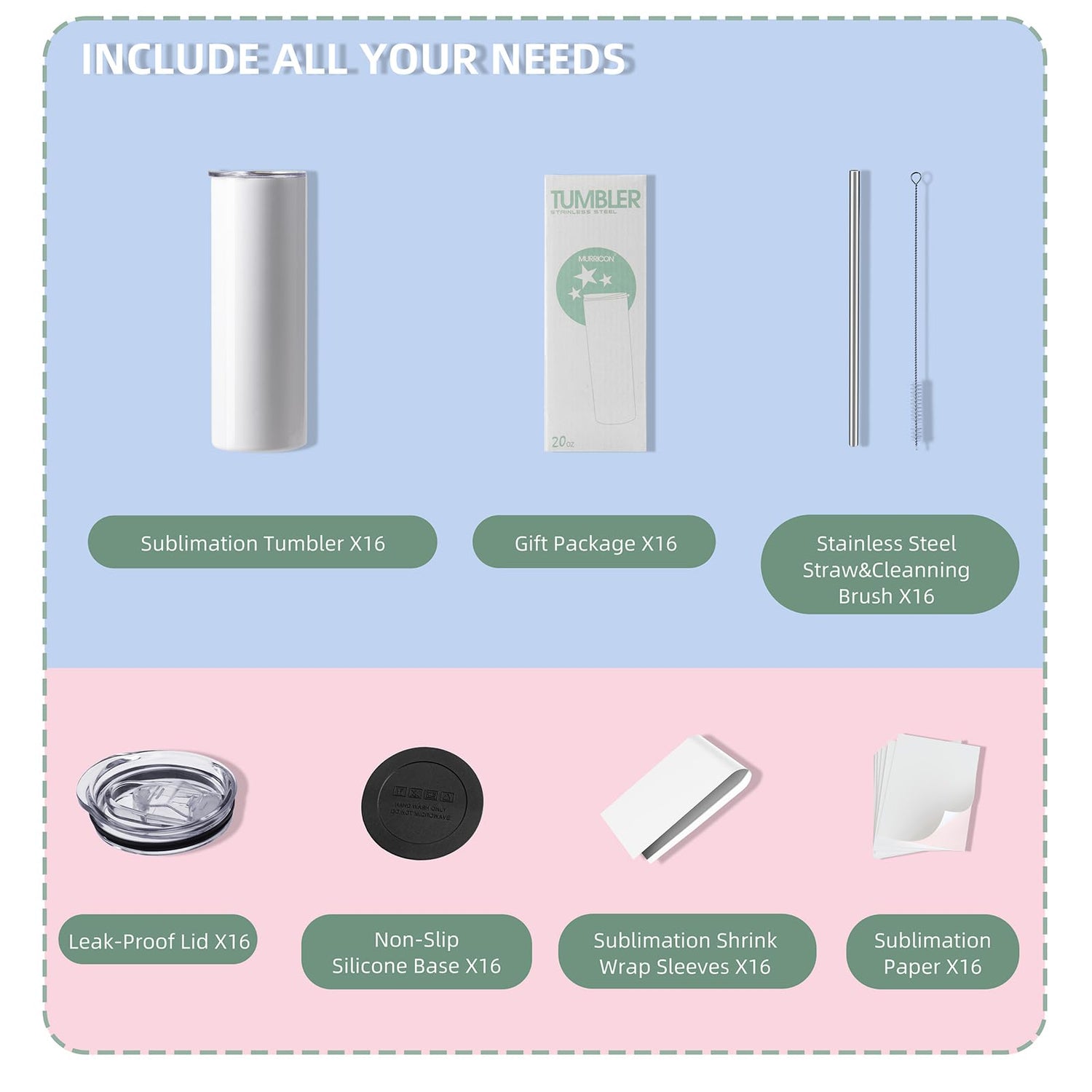 MURRICON 16 Pack Sublimation Tumblers 20 oz Skinny,Stainless Steel Insulated Sublimation Blanks Tumbler with Lid,Straw,Sublimation Paper,Individually Boxed,Shrink Wrap and Rubber Bottom