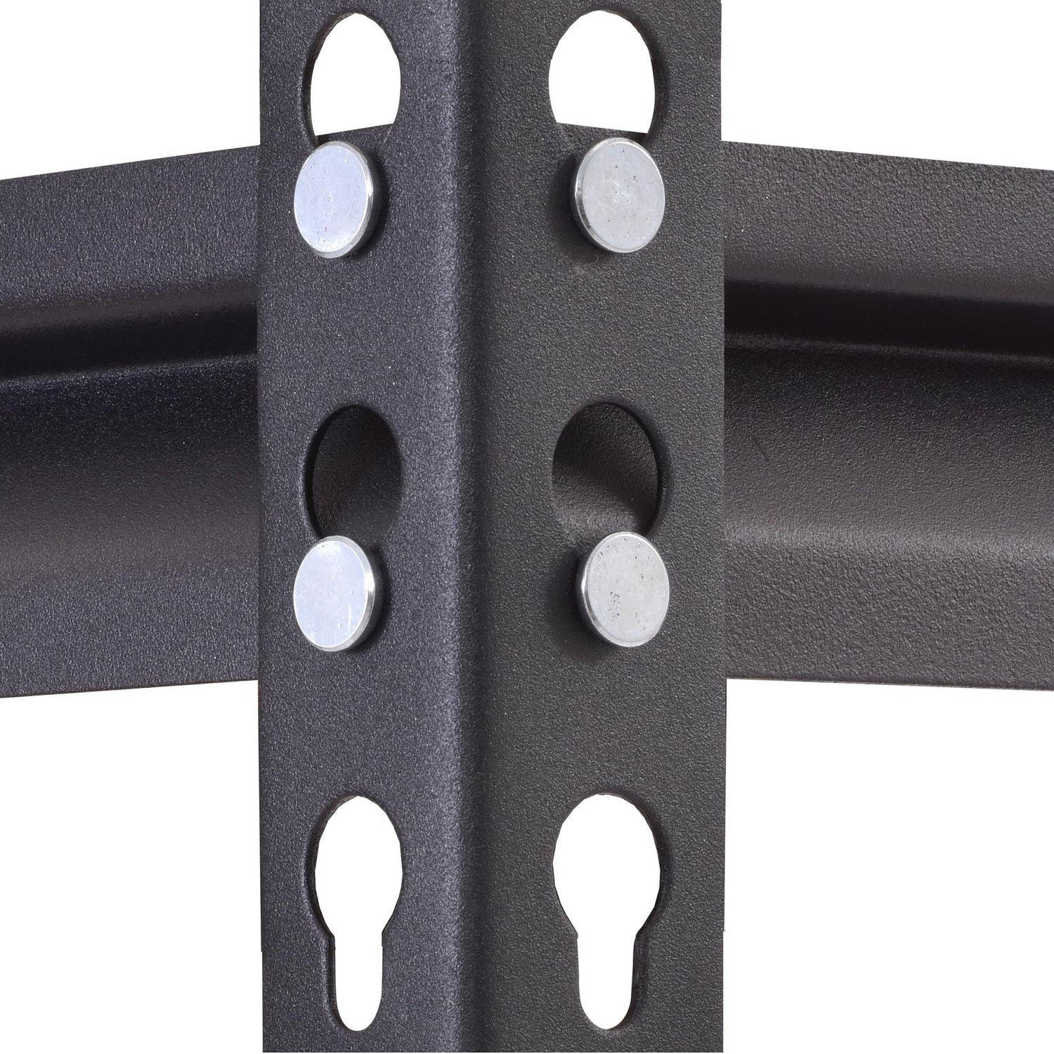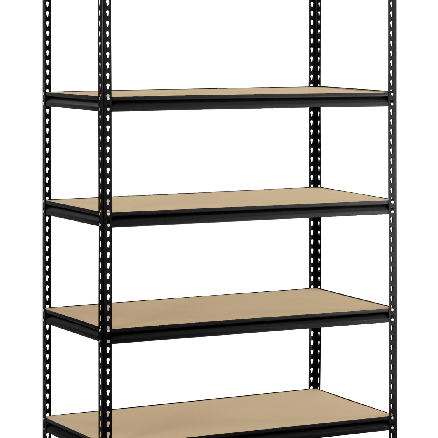 Details: The Edsal UR245L-BLK Maxi-Rack is a standing five-shelf unit with a steel rack and shelves made of particle board. This unit has riveted beams and riveted braces that lock into corner post rivet holes for structural security. The corner post rivet holes are punched at 1-1/2" intervals for precise installation of shelves at desired height. The steel rack has a black powder-coated finish to resist chipping and corrosion.