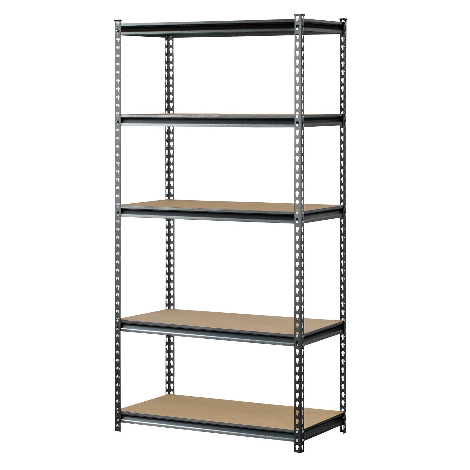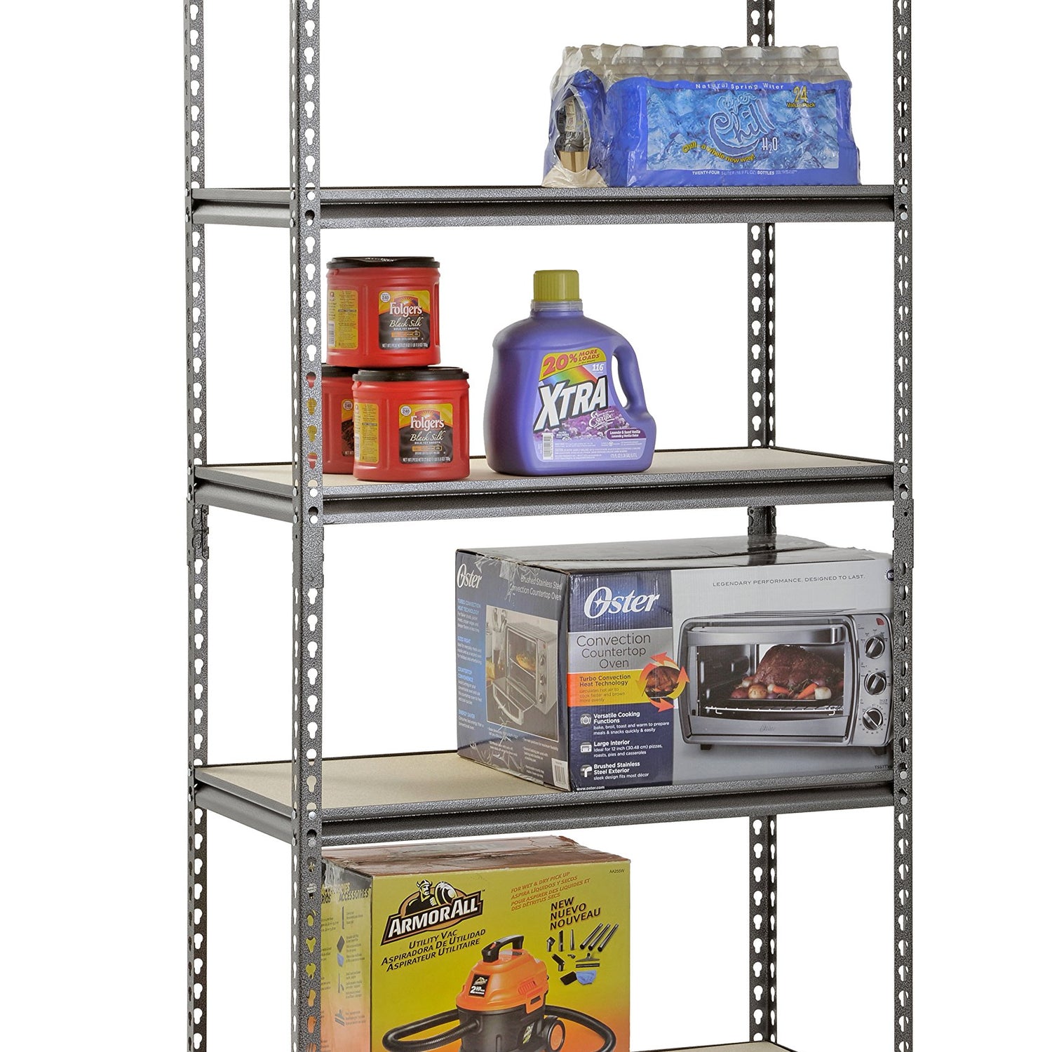 Details: Industrial grade steel construction with durable Silver vein finish. Z‐beam design beams for strength and rigidity. Five shelves with particle board decking can be adjusted in 1‐1/2" increments. Includes a post coupler to make assembly faster and easier, no nuts or bolts. Can be assembled vertically as a shelving unit or horizontally as a Workbench.