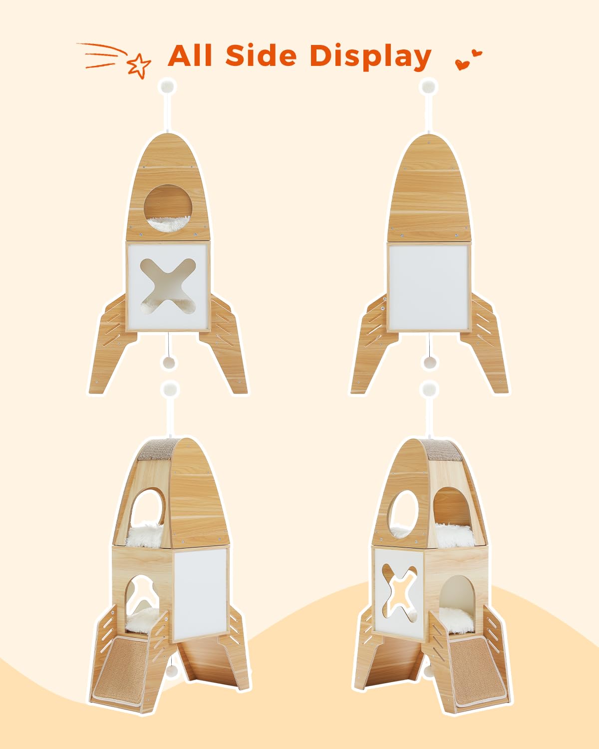 - Rocket-Ship Cat Tree: The 47.2" modern wood cat tree draws inspiration from space exploration, featuring a rocket-shaped design. Its arched base doubles as a cat tunnel, appealing to feline instincts for exploration. With two spacious and comfortable modern cat condos, it's suitable for cats weighing up to 12 pounds. At the top of the cat tree, there's an arched scratching board and a spring ball, catering to cats' natural inclination to perch at elevated spots while providing additional friction for scratching.