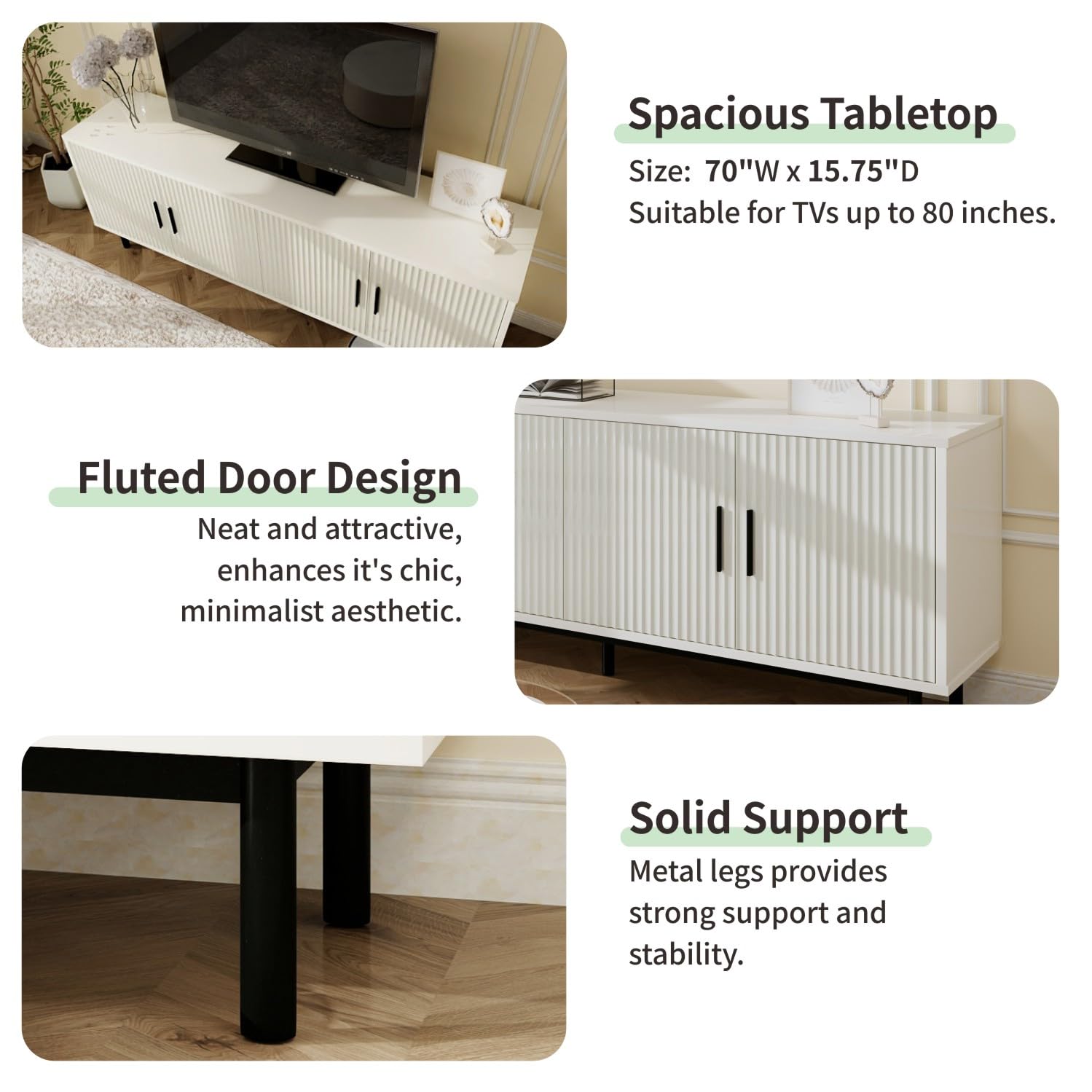 MUUEGM 70" Fluted TV Stand, Mid Century Modern Television Stands for Living Room, Wood TV Console for Televisions Up to 80 Inches, Entertainment Center with Storage, Adjustable Shelf, White TV Stands