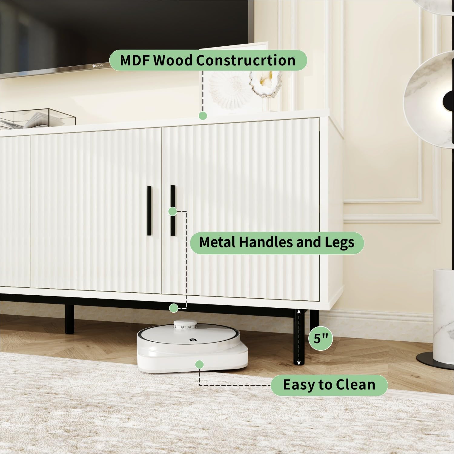 - 【DURABLE & ELEGANT DESIGN】Crafted from high-quality wood, this TV stand is built for durability and long-lasting use. The decorative laminate top is resistant to deformation, providing a reliable surface for your TV and electronics. With elegant fluted panels and stylish metal handles, this entertainment center seamlessly blends modern aesthetics with practicality, enhancing the beauty of any room.