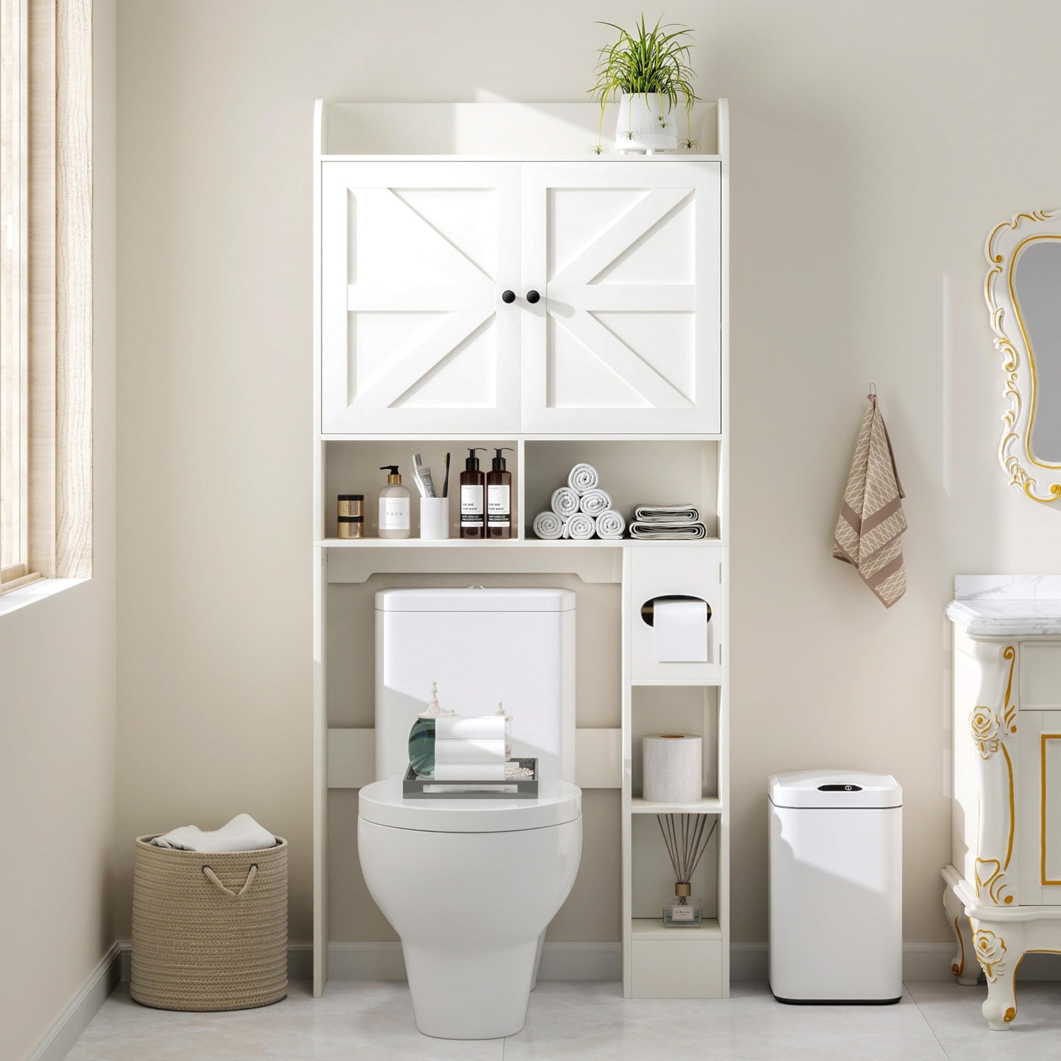 MUUEGM Over The Toilet Storage Cabinet with Barn Doors, White Bathroom Organizer, Farmhouse Tall Bathroom Storage Cabinet with Toilet Paper Holder, Above Toilet Shelf for Restroom, Laundry