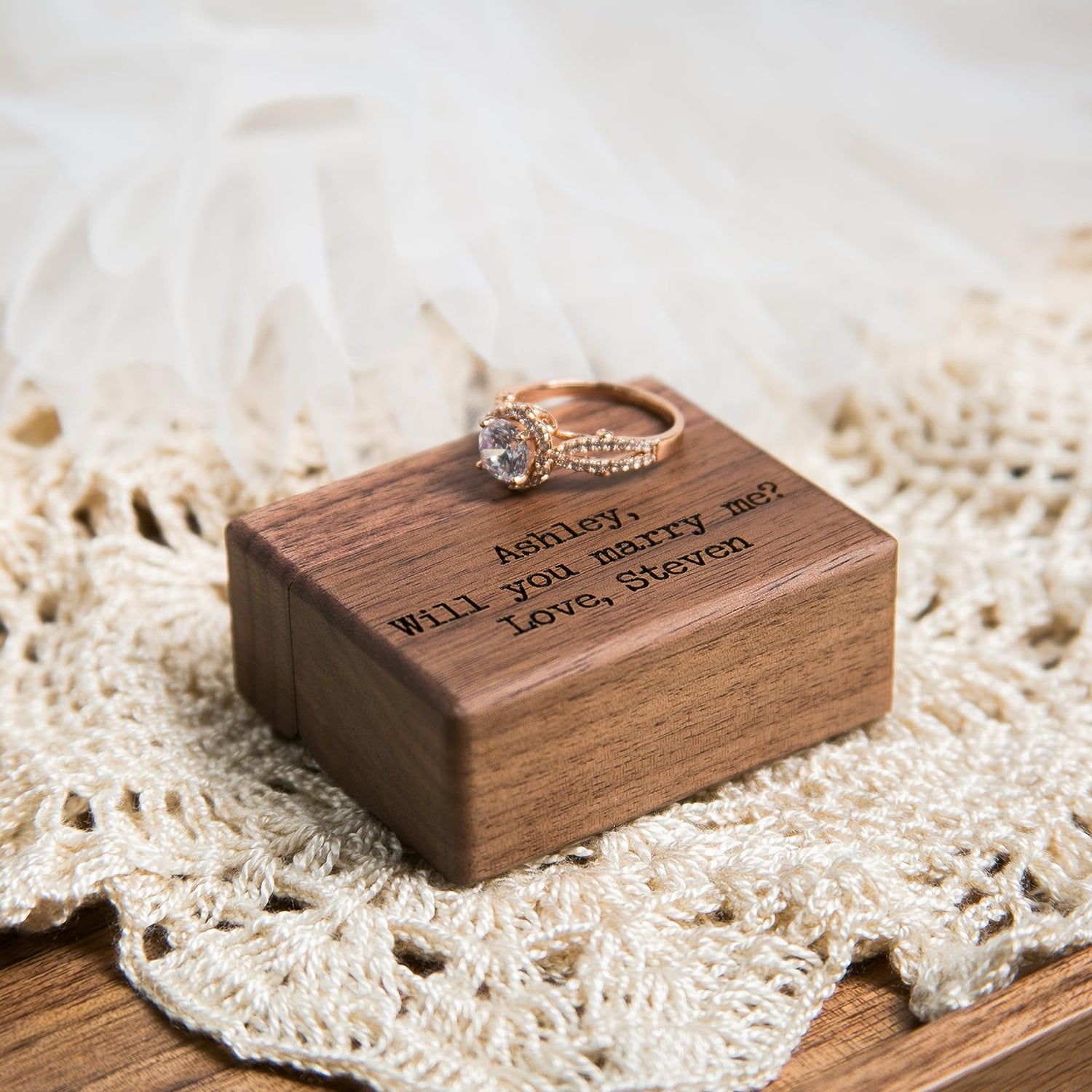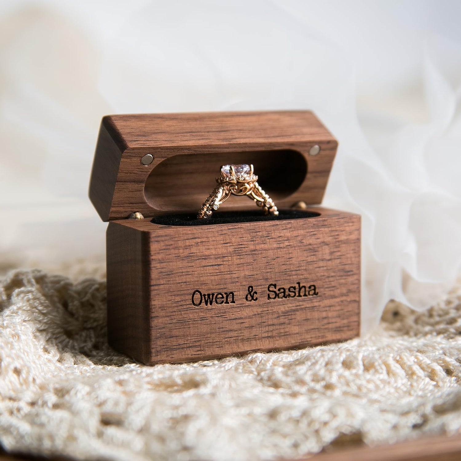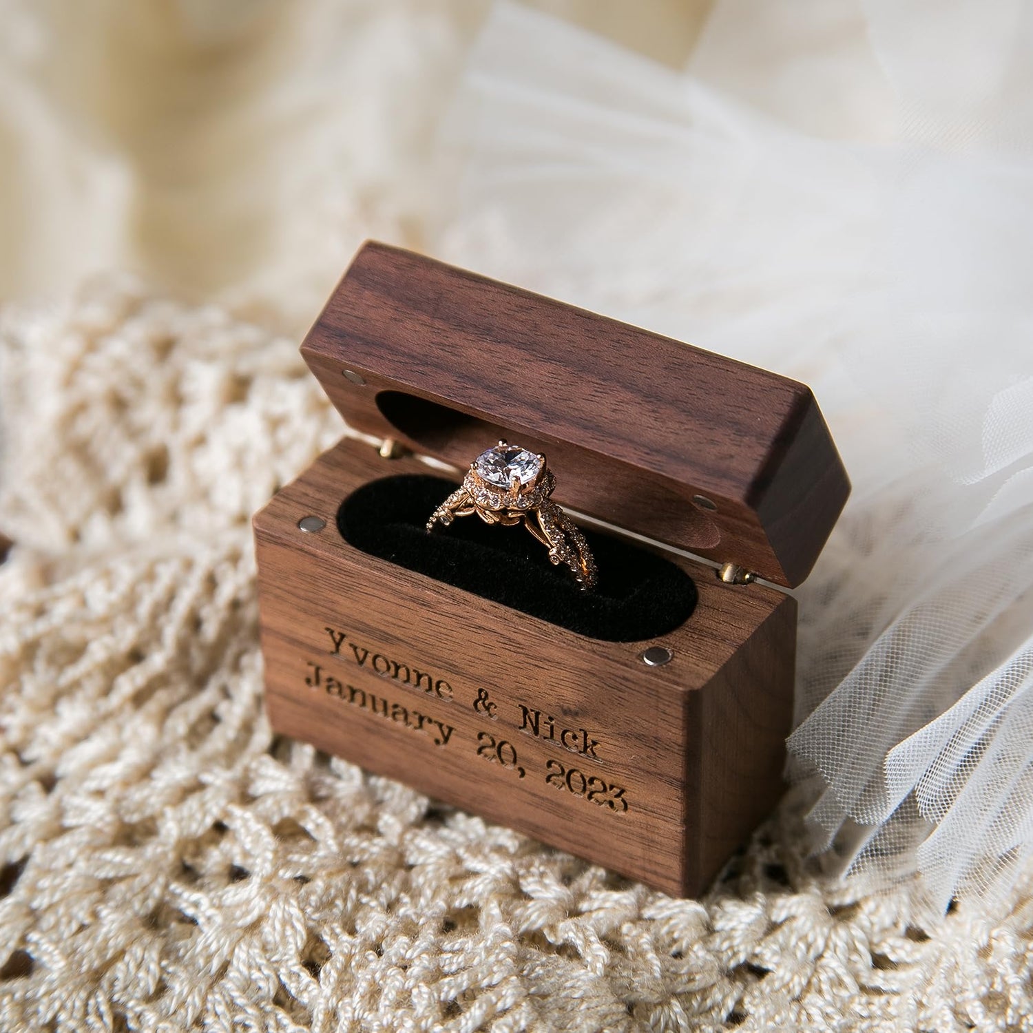 - Custom engraved walnut wood ring box for 1 ring. Personalize with your names, initials, date, or any text.