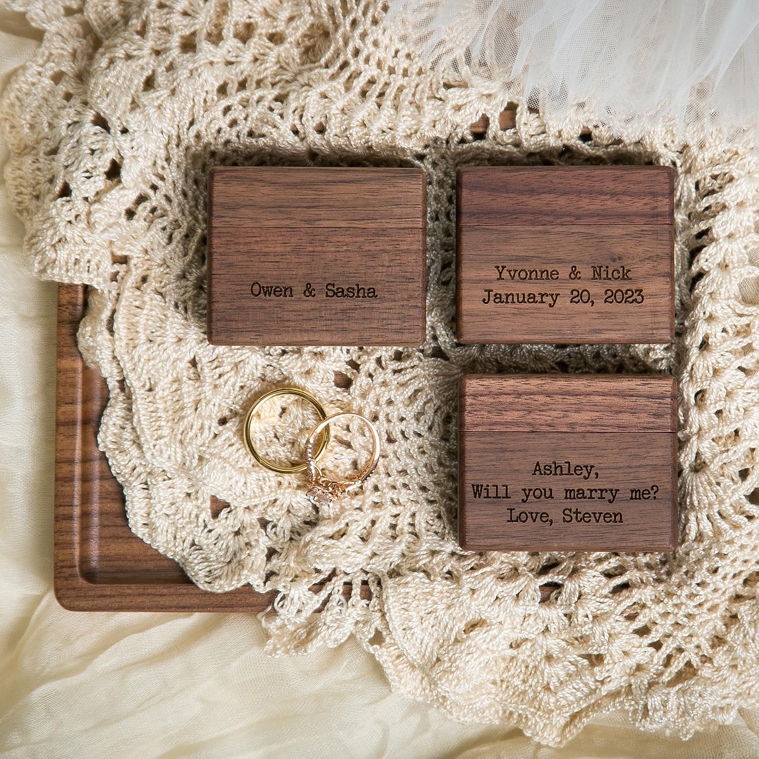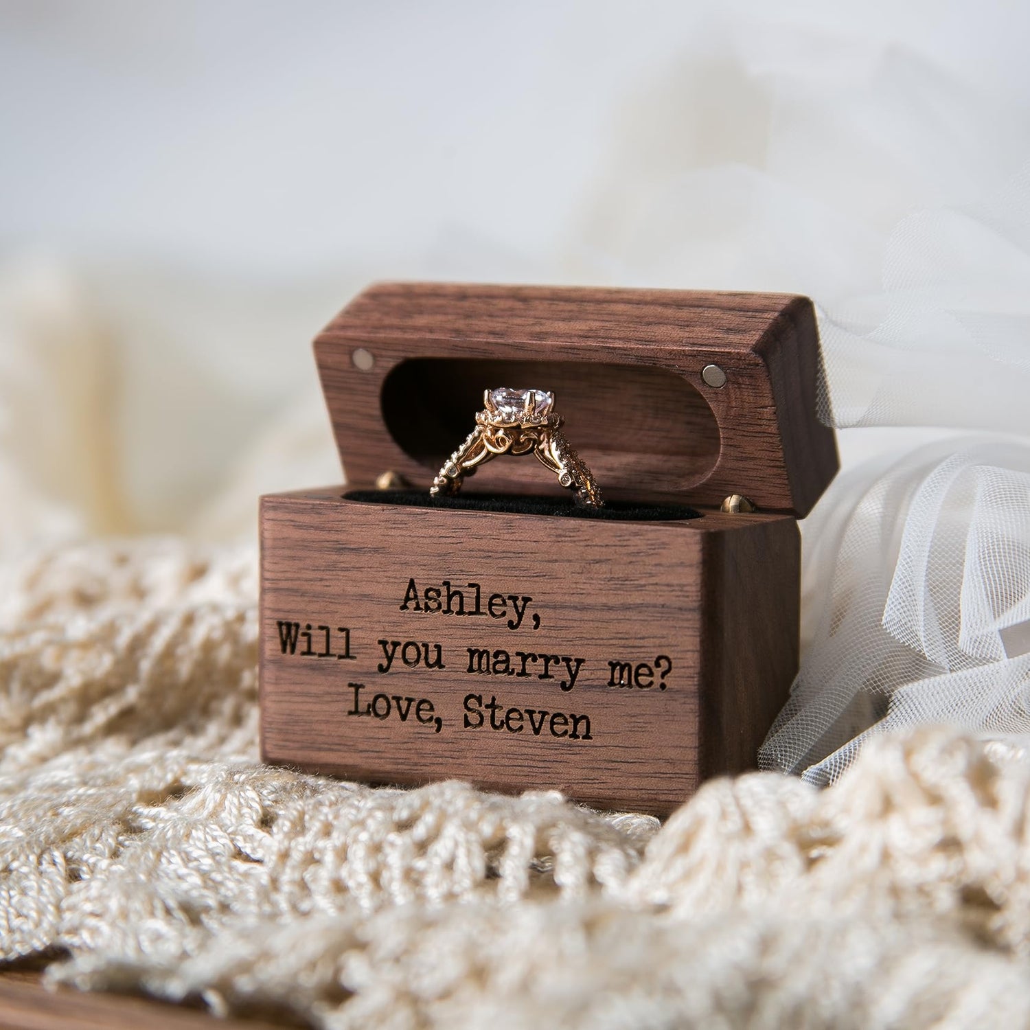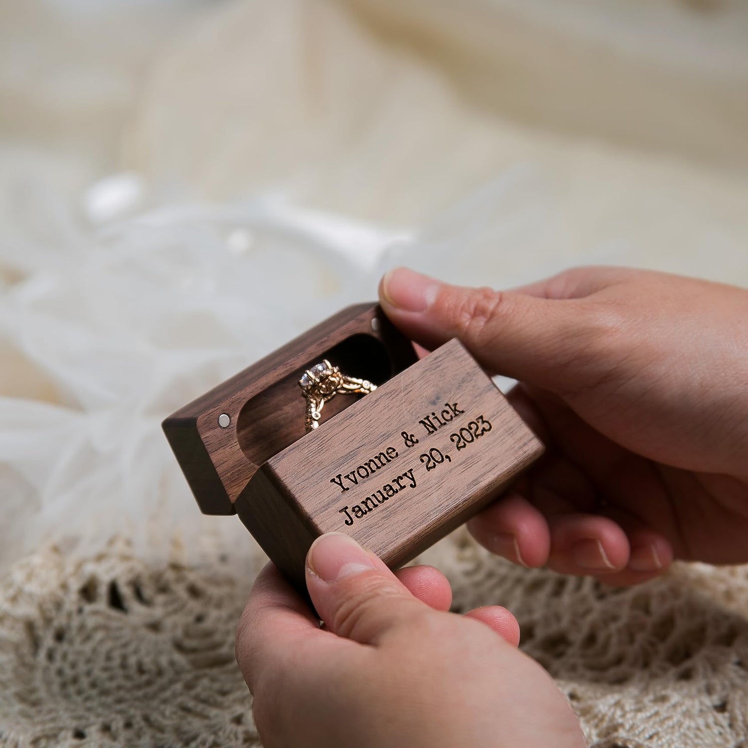 - Custom engraved walnut wood ring box for 1 ring. Personalize with your names, initials, date, or any text.