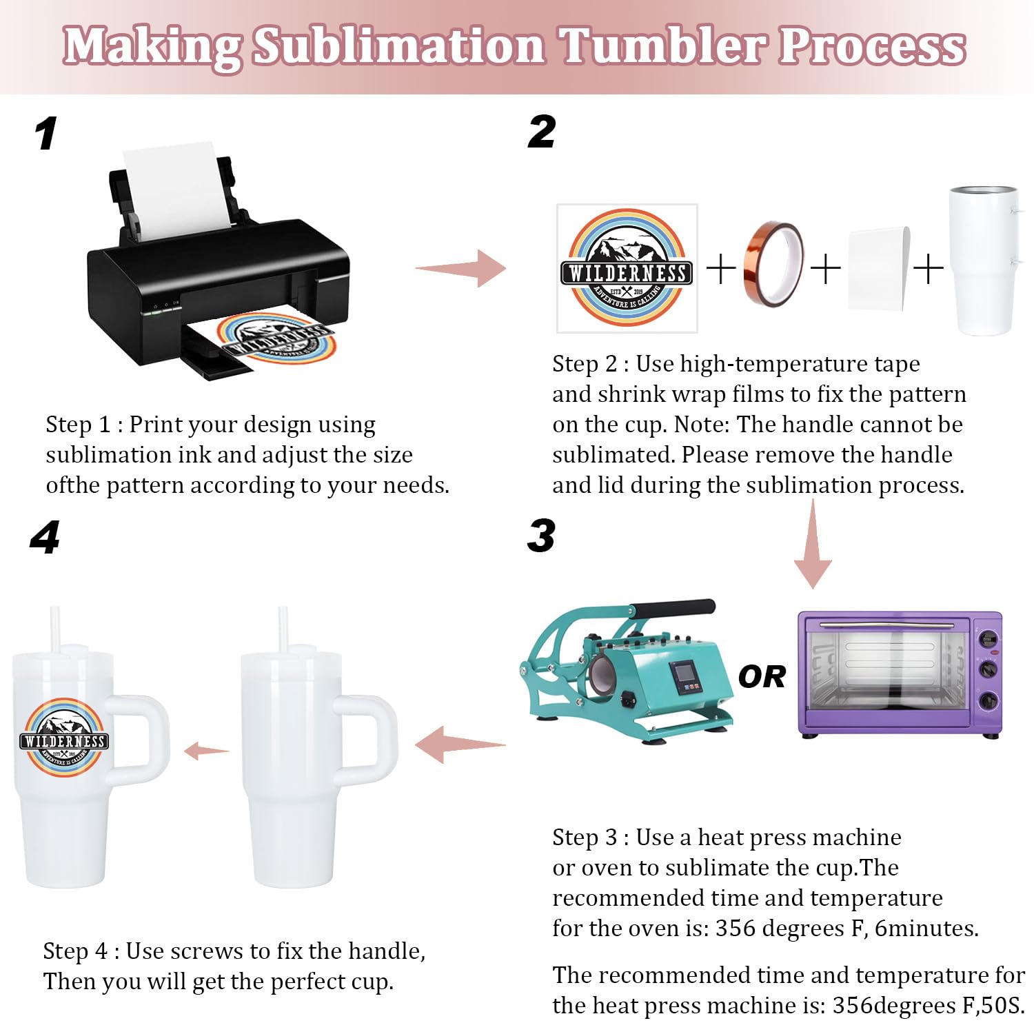 - 【Sublimation Process】 The 14 oz Sublimation tumblers can be sublimated using heat press and convection oven. Convection oven recommended: 350℉, 5~6 minutes. Heat press recommended: 350℉, 50 seconds.The handle cannot be sublimated, please remove the handle before sublimation.