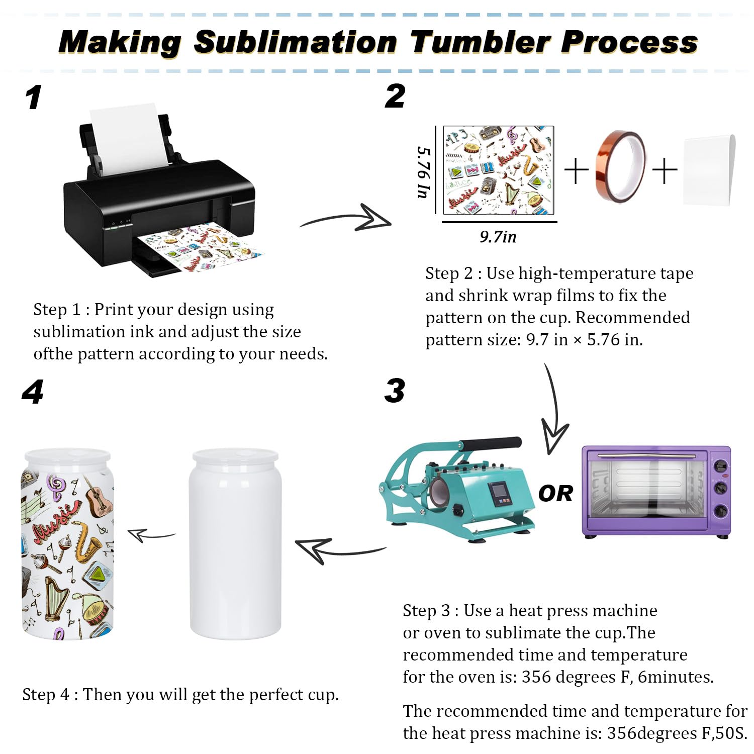 - Sublimation Process: You can use a heat press machine or convection oven to sublimate the mug. Heat press machine: 356 ℉, 50 seconds. Convection oven: 360 ℉, 5-6 minutes. It is recommended to use a heat press machine to sublimate the tumbler.