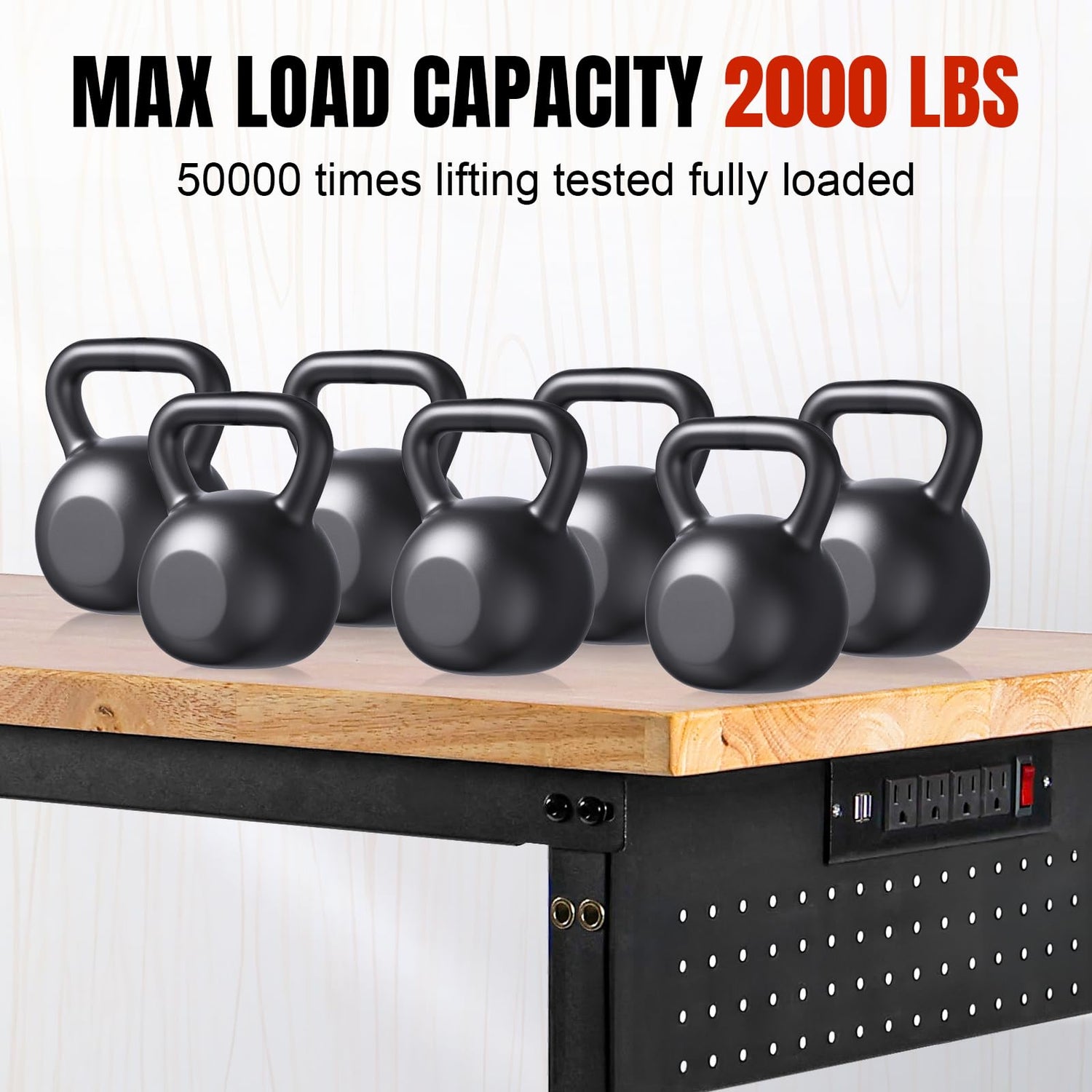 - ETL CERTIFIED POWER OUTLET: The garage table is equipped with ETL certified power outlets for more safety and durability. 4 AC outlets, 2 USB ports, cord length 6.6 inches, easy to use a variety of appliances and lamps. In addition, we matched with a pegboard and hooks for easy storage of tools to keep your workbench neat and tidy.
