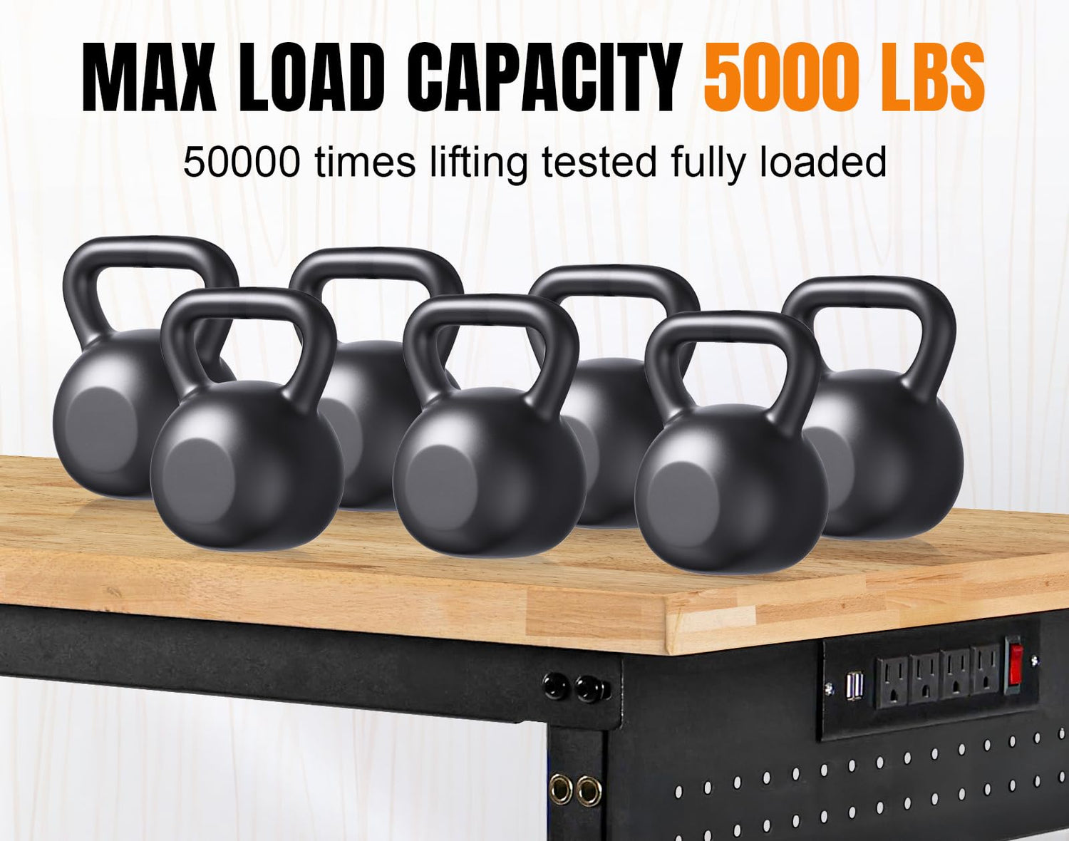- SOLID RUBBER WOOD AND REINFORCEMENT BARS: 84” x 24”solid rubber wood tabletop. With an upgraded metal frame, this heavy-duty workbench has a weight capacity of over 5,000 lbs. Extra support rods make the workbench even more stable.