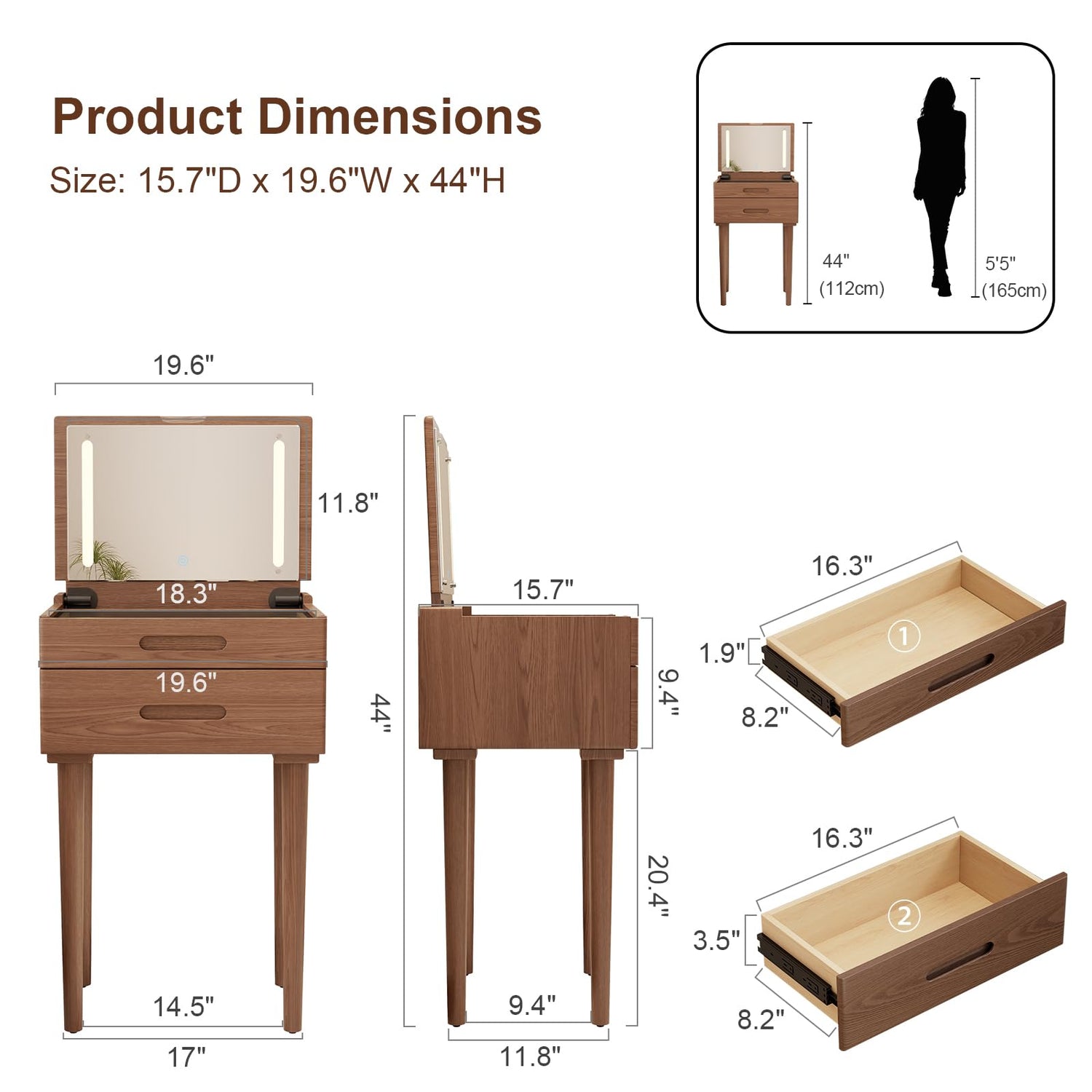Muwuele Solid Wood Small Vanity Desk with Flip Top Mirror, Brightness Adjustable Lights, Compact Vanity with Glass Top and Drawers, Slim Dressing Table for Small Space, Bedroom, Living Room, Walnut