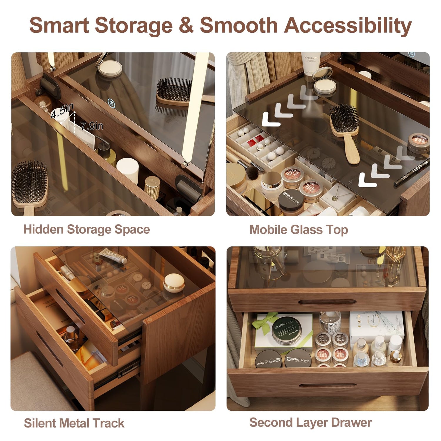 - 【SMART & SAFE STORAGE】This small makeup vanity offers tall bottle storage, a mobile glass top for neat makeup organization, and soft-close hinges to prevent slamming, ensuring safety and convenience