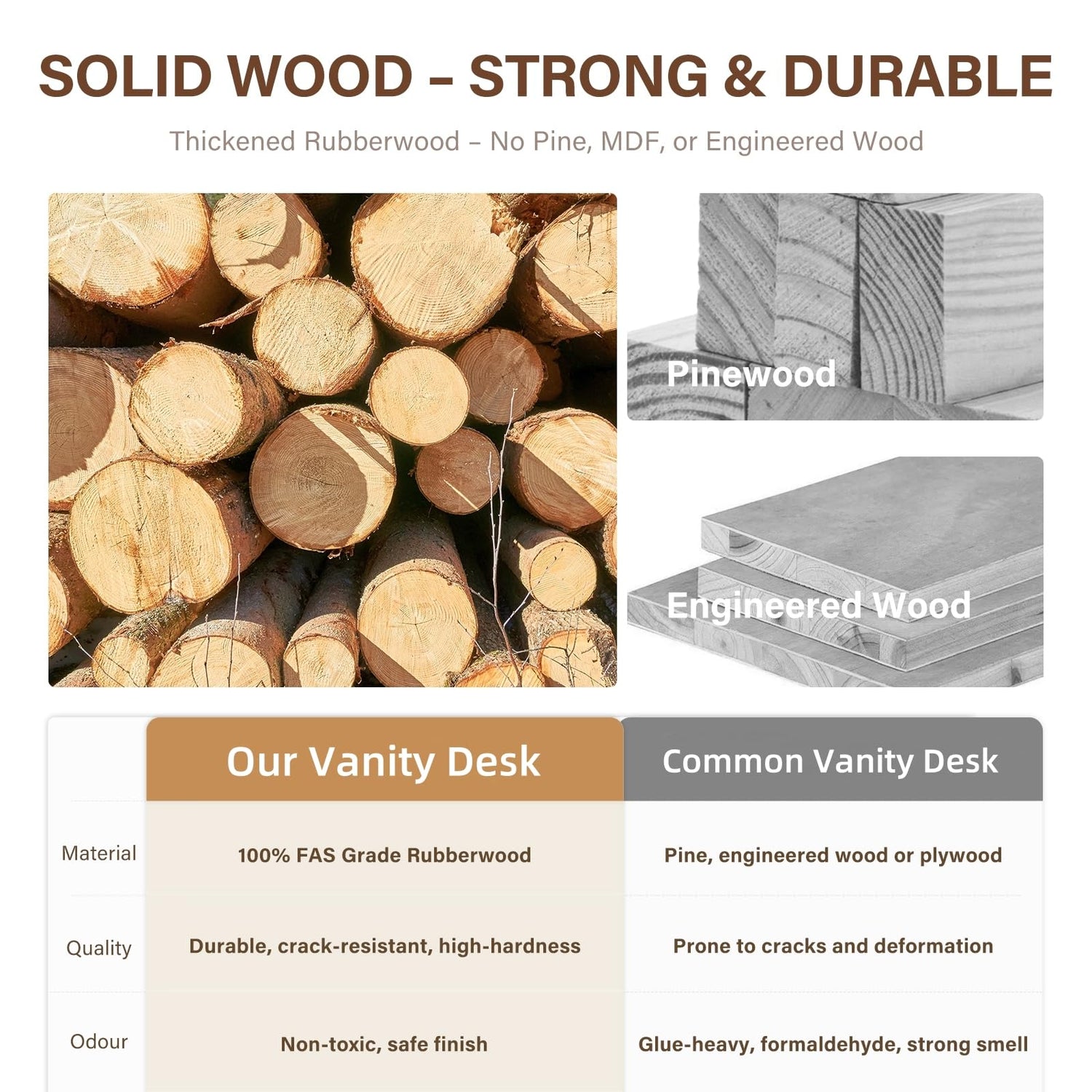 - 【PREMIUM SOLID WOOD BUILD】Crafted from 100% FAS-grade rubberwood, this mini vanity offers lasting stability. Thick legs ensure durability, and any mild initial scent naturally fades within 24–48 hours