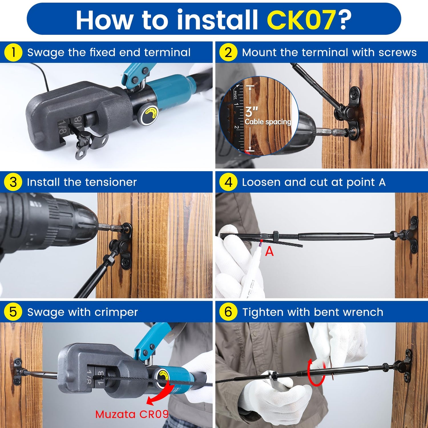 - Easy to install: This cable railing kit does not require any pre-drilling and can be simply installed by tightening the screws. The wide adjustable range makes installation easier, especially for beginners, who might not cut the cable to the precise length. You can use a steel rod, like an allen wrench (not included), alongside the bent wrench to assist in tightening the turnbuckle for a labor-saving installation. Apply for both wood posts and wood posts with sleeves
