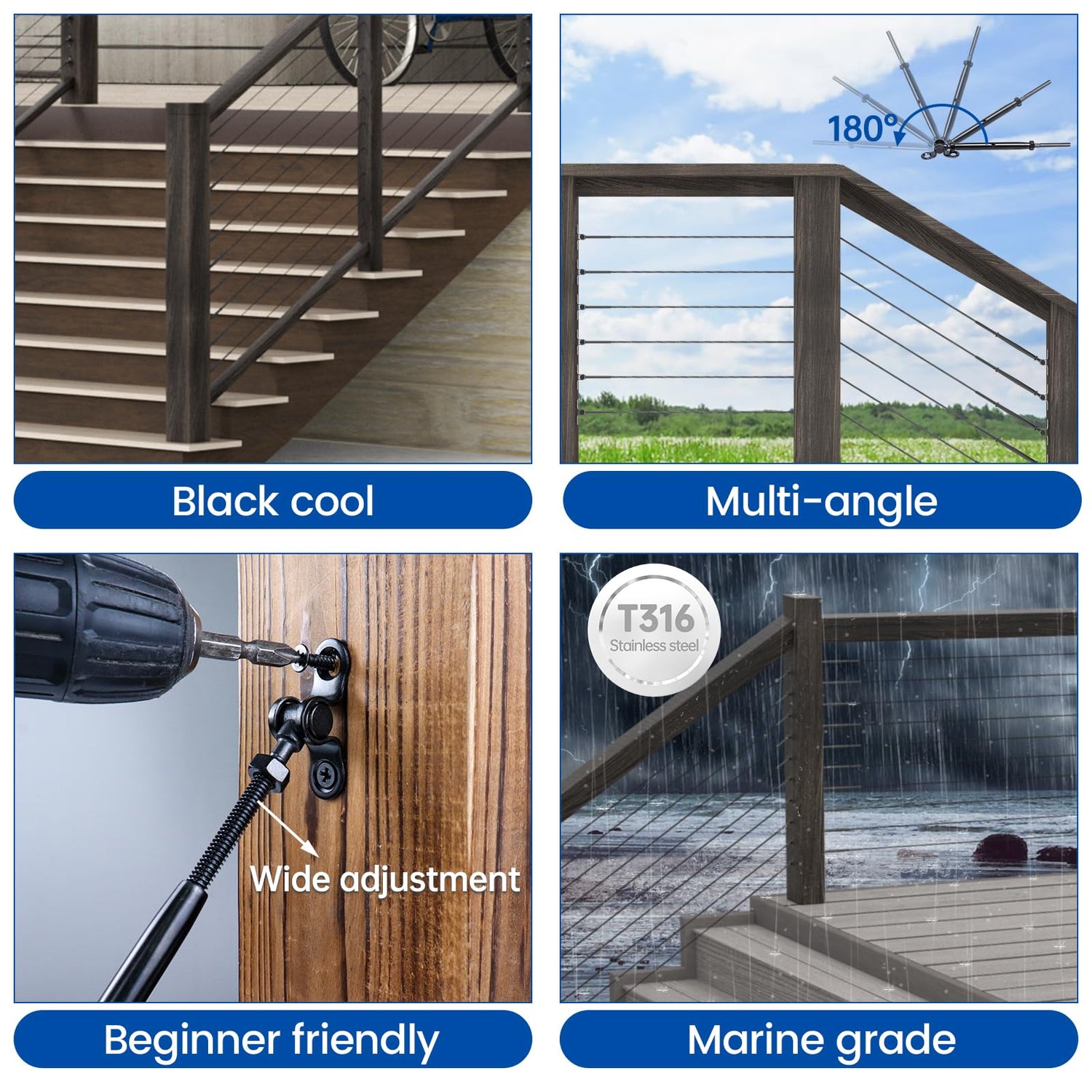 - Multi-Angled and Wide-Adjustment: This cable railing kit works for 1/8" wire rope in multi-angled stairways as well as horizontal sections. The multi-angle feature and adjustable closed-body enables the turnbuckle to rotate from 0-180 degrees and adjust freely from the max length of 10.1 inch to the min length of 6.8 inch