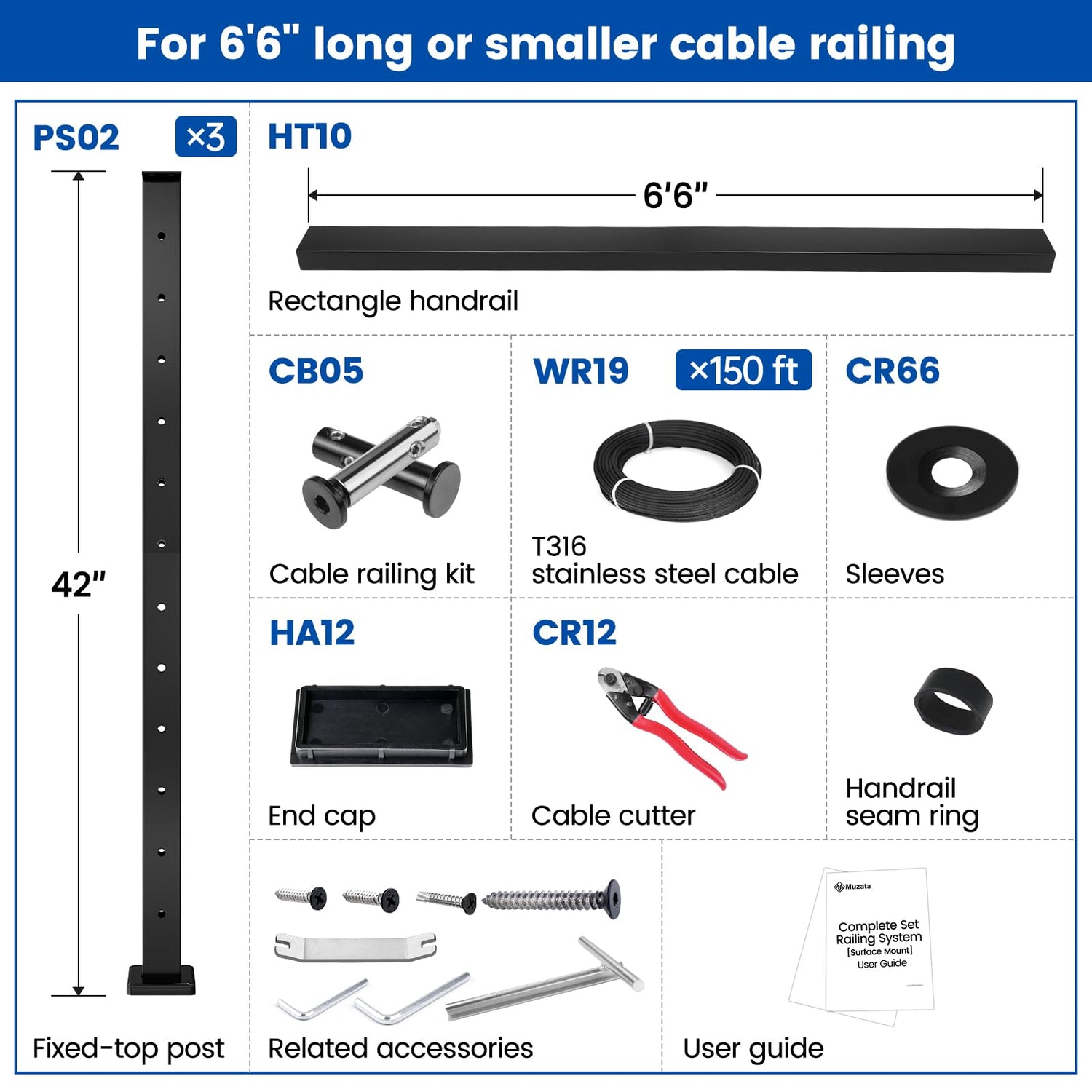 - One Purchase, Complete Solution: Get a comprehensive solution with just one purchase! 3'- 6'6"FT Surface Mount Complete Set 42" Stair Cable Railing System includes 1pc handrail HT10, 3pcs Cable Railing Posts PS01, 150ft T316SS Wire Rope WR19, Swageless Invisible Cable Railing Kit CB05, Adhesive Washers CR66 and Cable Cutter CR12. If you need level system, pls search for Muzata RCS2