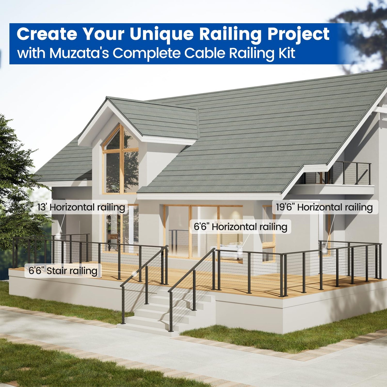 - Easy to Install: No hydraulic crimper needed! Our cable railing kit features a patented swageless design, saving time and money and simplifying installation. For one-post corner or stair to landing solution, search Muzata CB17 cable terminals for seamless transitions. Plus, we include a detailed paper user guide for installation steps