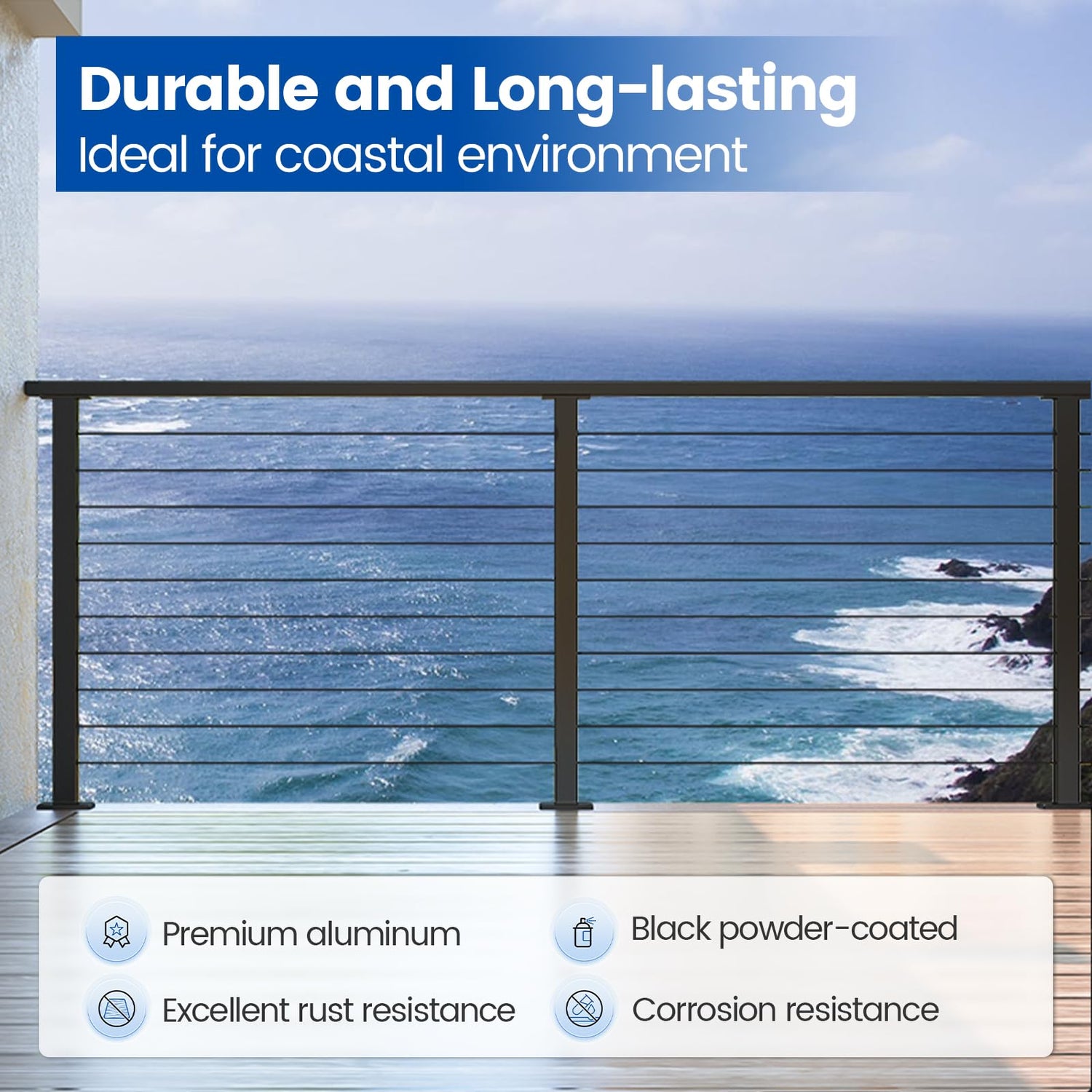 - For coastal projects: This black cable railing post is made of quality aluminum with great rust resistance to work for a long lifetime. This material allows it to work on the seaside or in highly salty areas
