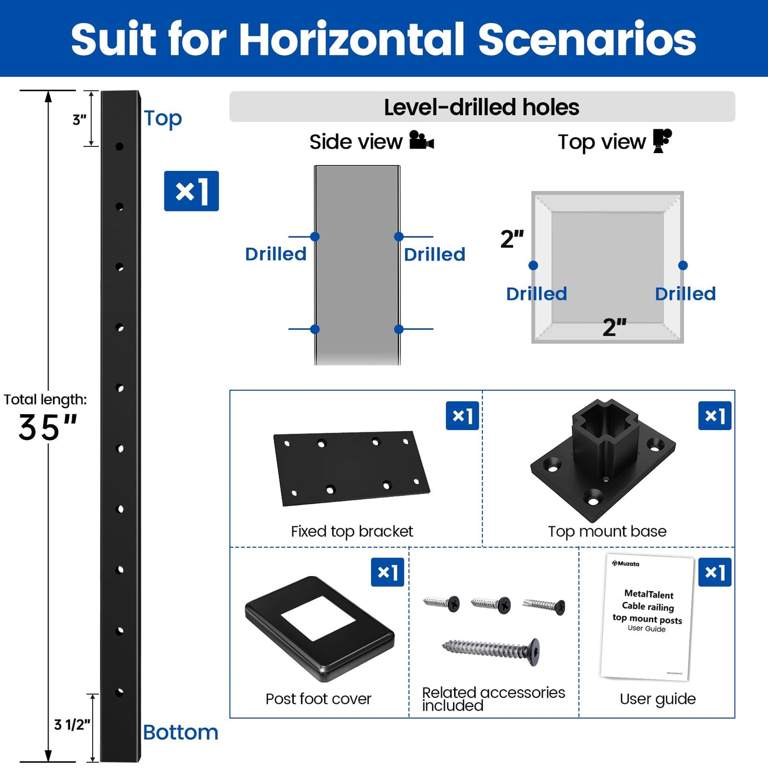 Muzata Aluminum Black Cable Railing Post 36 Inch 36"X2"x2" Level Drilled Surface Mount Cable Railing System Kit Indoor Outdoor Seaside with Paper User Guide PD02 BHAS