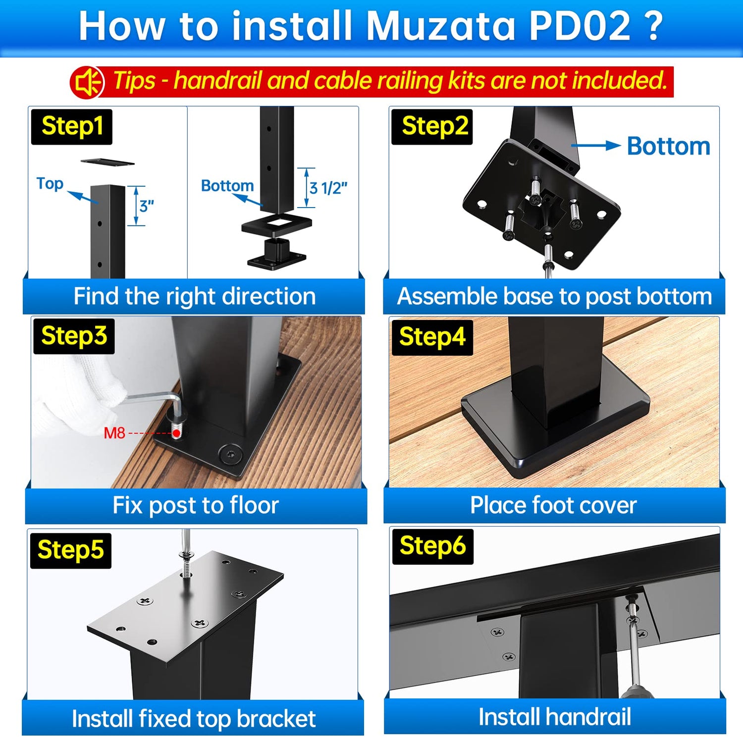 - Advice for constructing a system: we recommend the following product combinations from Muzata, including cable railing kits CB04 CB17, wire rope WR19, protector sleeve CB28, adhesive washer CR66, angled washer CR60, stair post PD01 BAAS, level post PD02 BHAS, corner post PD02 B3AS, handrails HL10 BPA, handrail connectors HA01 HA02 HA23