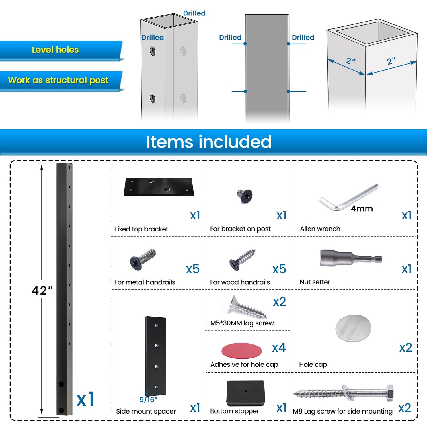 - Side-mount Installation: This 36" square post (black finish) is designed to be installed against the side of the landing. It is pre-drilled with 10 pairs of level holes to work on horizontal sections and save your labor. It can act as both structural end post and middle post in level sections. This cable railing post comes with a flat bracket to fit flat handrails