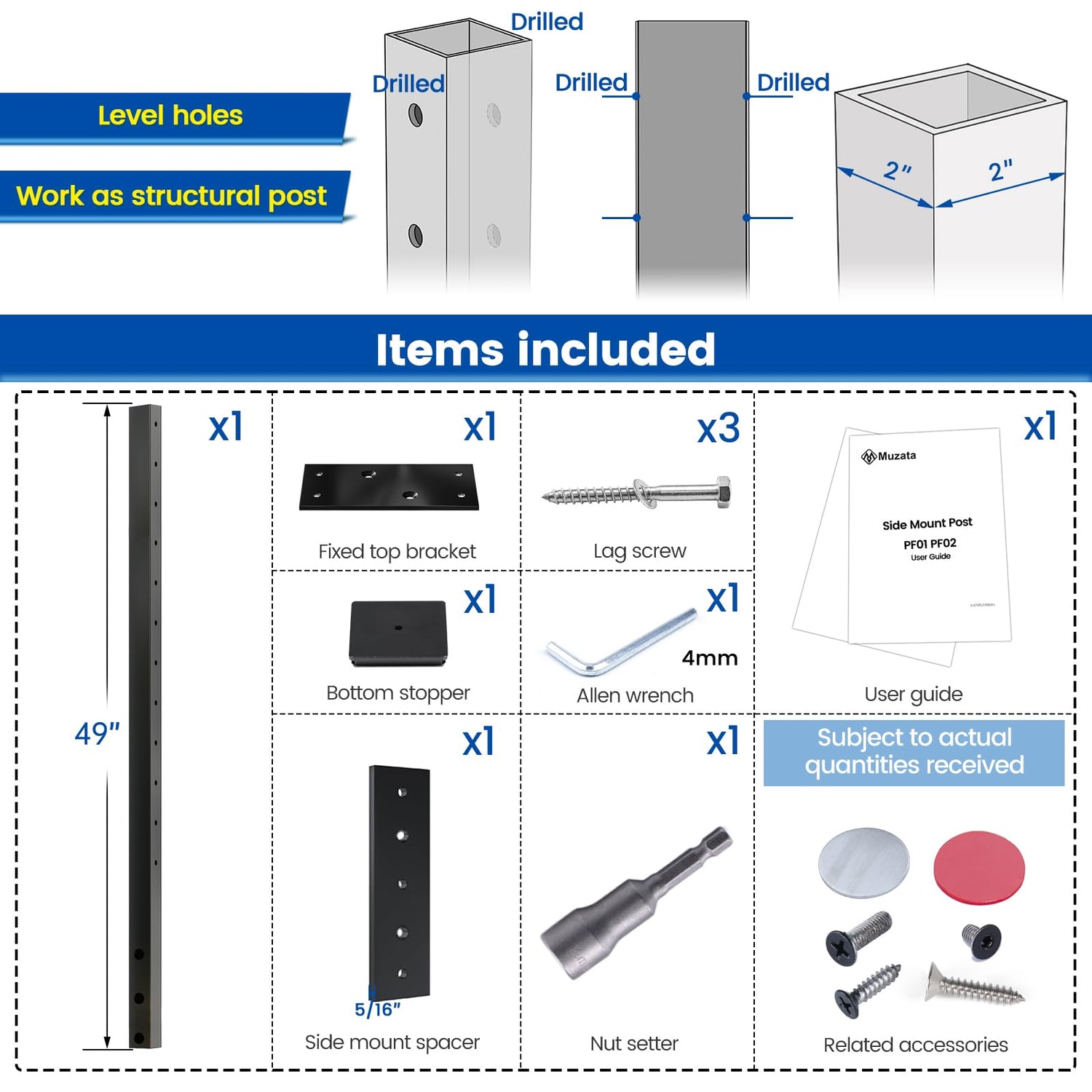 - Side-mount Installation: This 42" square post (black finish) is designed to be installed against the side of the landing. It is pre-drilled with 12 pairs of level holes to work on horizontal sections and save your labor. It can act as both structural end post and middle post in level sections.