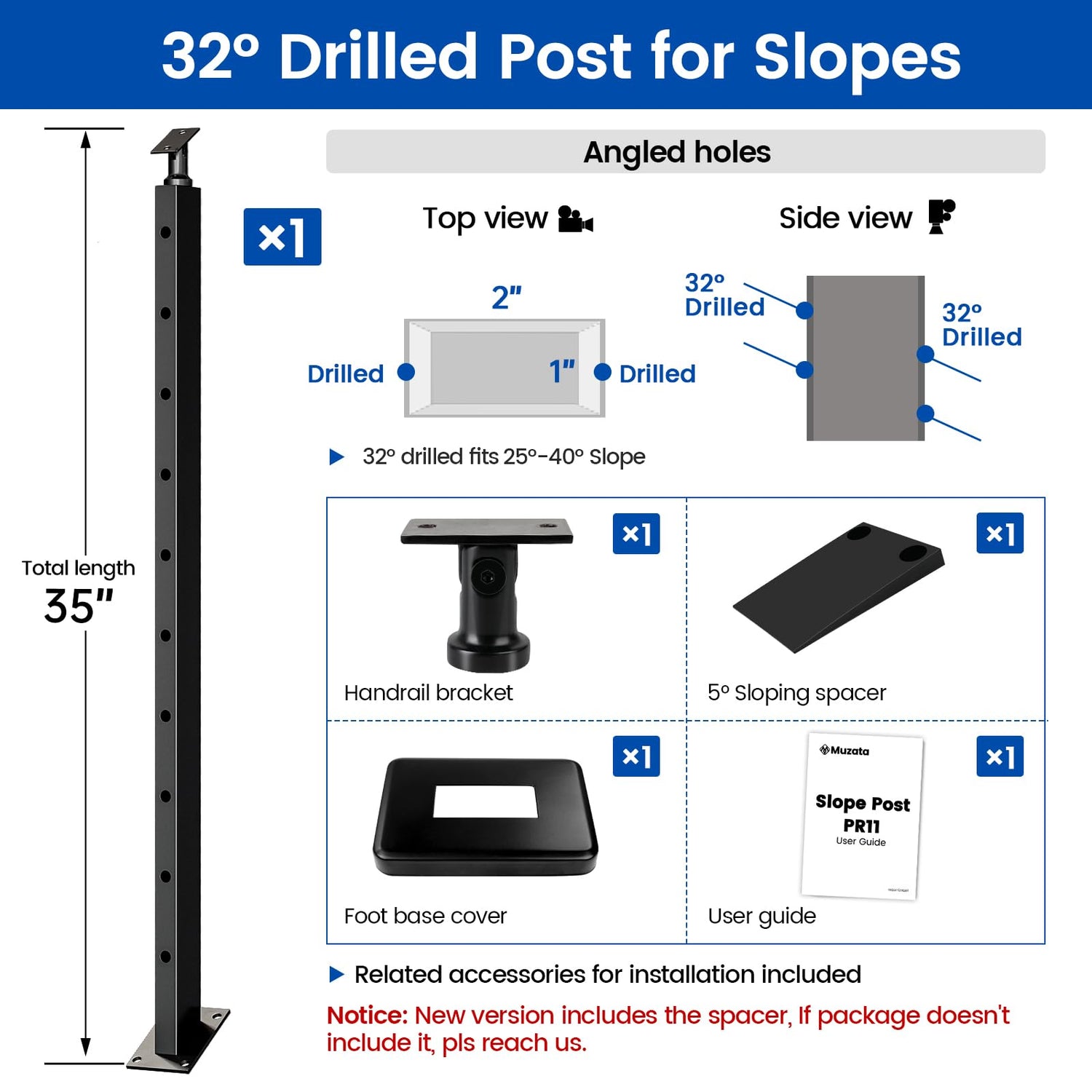- IMPORTANT to know before purchases: This cable railing post is specially designed for 30-35 degree slope. It is pre-drilled with 10 pairs of angled holes to save your labor. You can check the method in figure 3 to measure the angle of your stairs and if your stairs are not included in 30 to 35 degrees(but included in 25 to 40 degrees), you can adjust the angle with 5° sloping spacer PA31