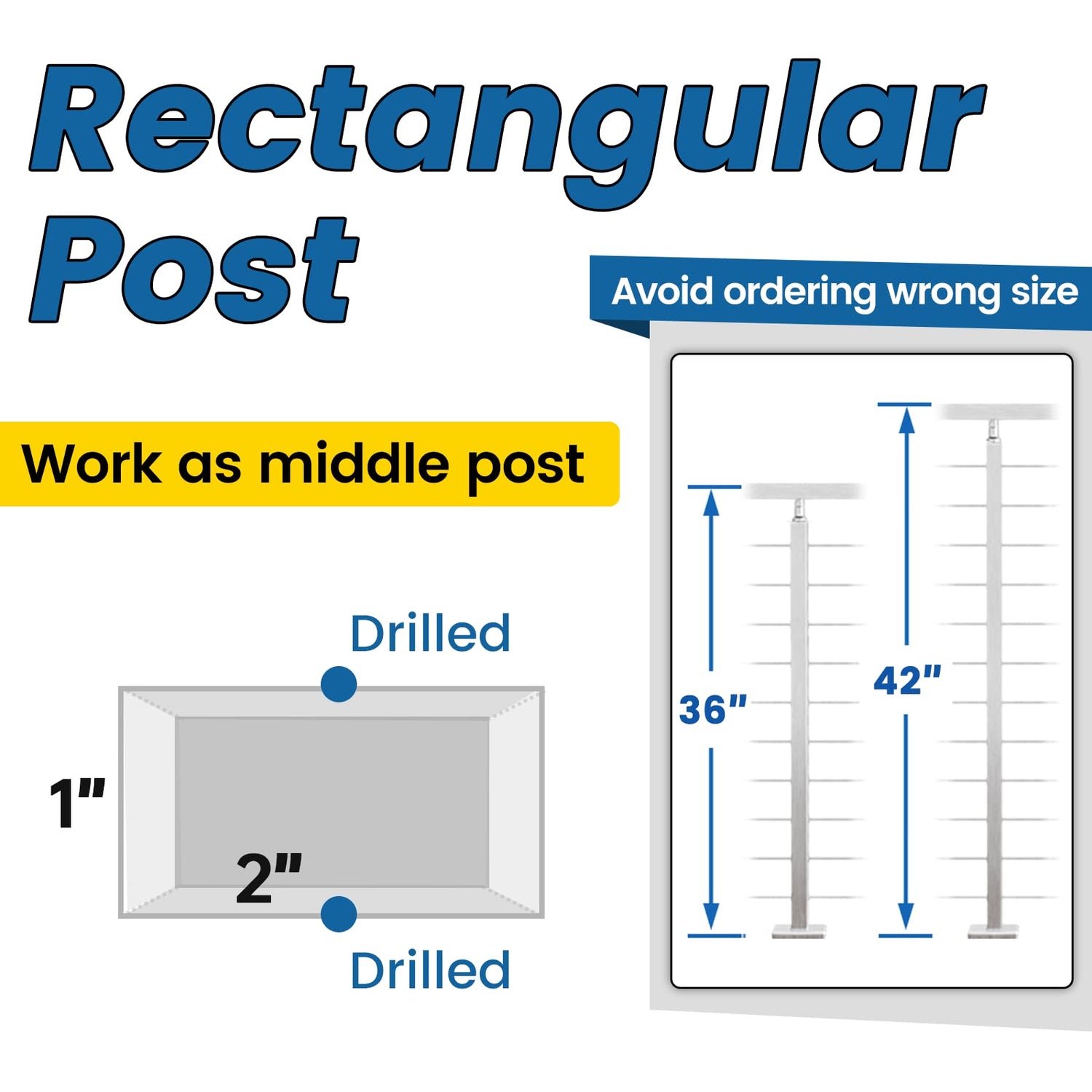 - Intermediate Post - This 42" rectangular cable railing post (brushed finish) is specially designed to be used as intermediate post between two structural posts. With a thickness of 1", it can bring you safety and an unblocking view at the same time. It is undrilled, allowing you to drill the holes by yourself to meet unusual needs. If you need extra foot cover, pls search muzata PA11
