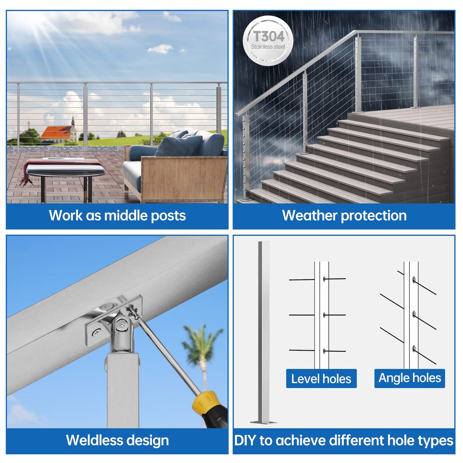 - Weather protection - This cable railing post is made of quality T304 stainless steel with great rust resistance and will work for a long lifetime. It is ideal for both indoor and outdoor applications like deck, stair, porch, balcony, and fence. However, plz note that T304 is not recommended for projects within 10 miles of the seaside or saltwater. Need posts applicable in humid conditions, please search Muzata PM05 to find the aluminum cable railing posts