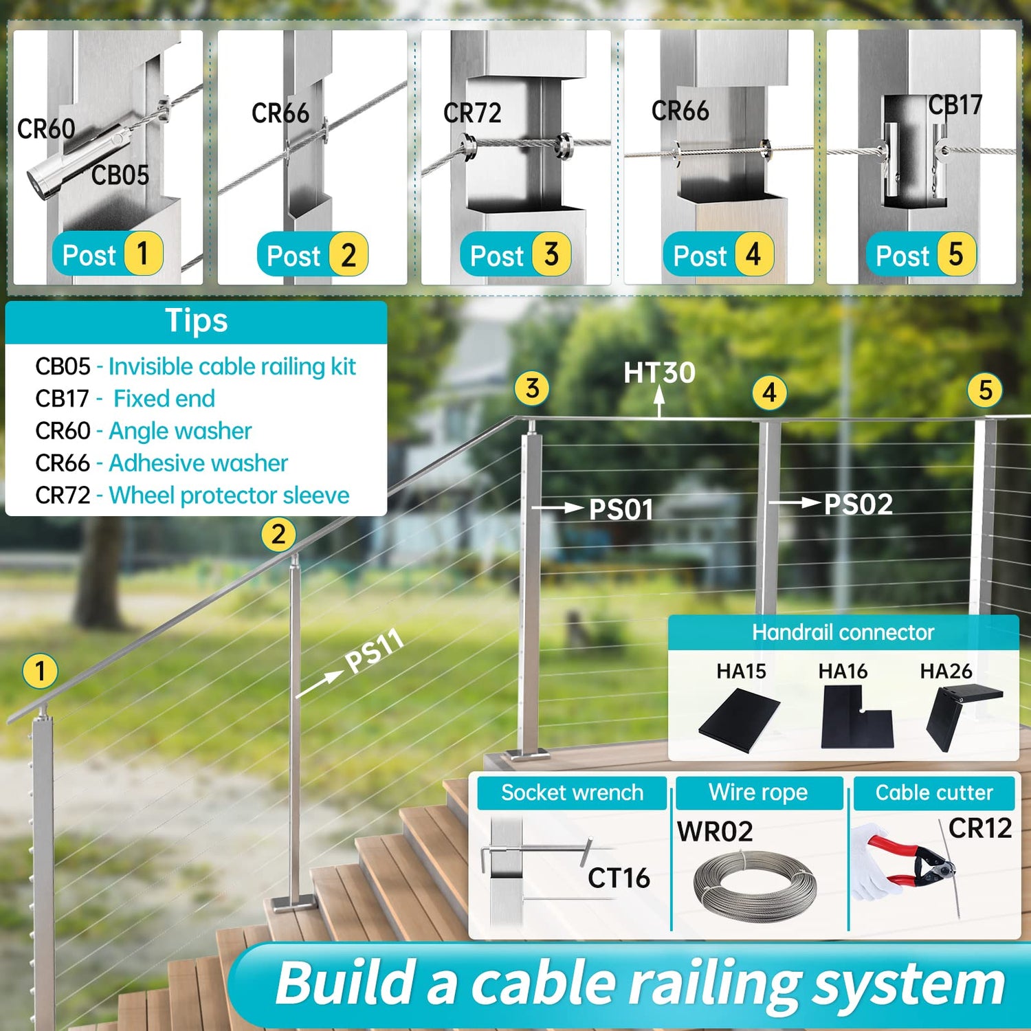 - Pre-designed System - We pre-designed a cable railing system to help you get a fully customized cable railing project. Components to build the system are sold separately: brushed structural posts PS01 PS02, brushed intermediate posts PS11, brushed handrails HT30 SL4, cable railing kits CB05 CB17, protector sleeves CR66 CR72, angled washer CR60, wire rope WR02, cable cutter CR12, socket wrench CT16