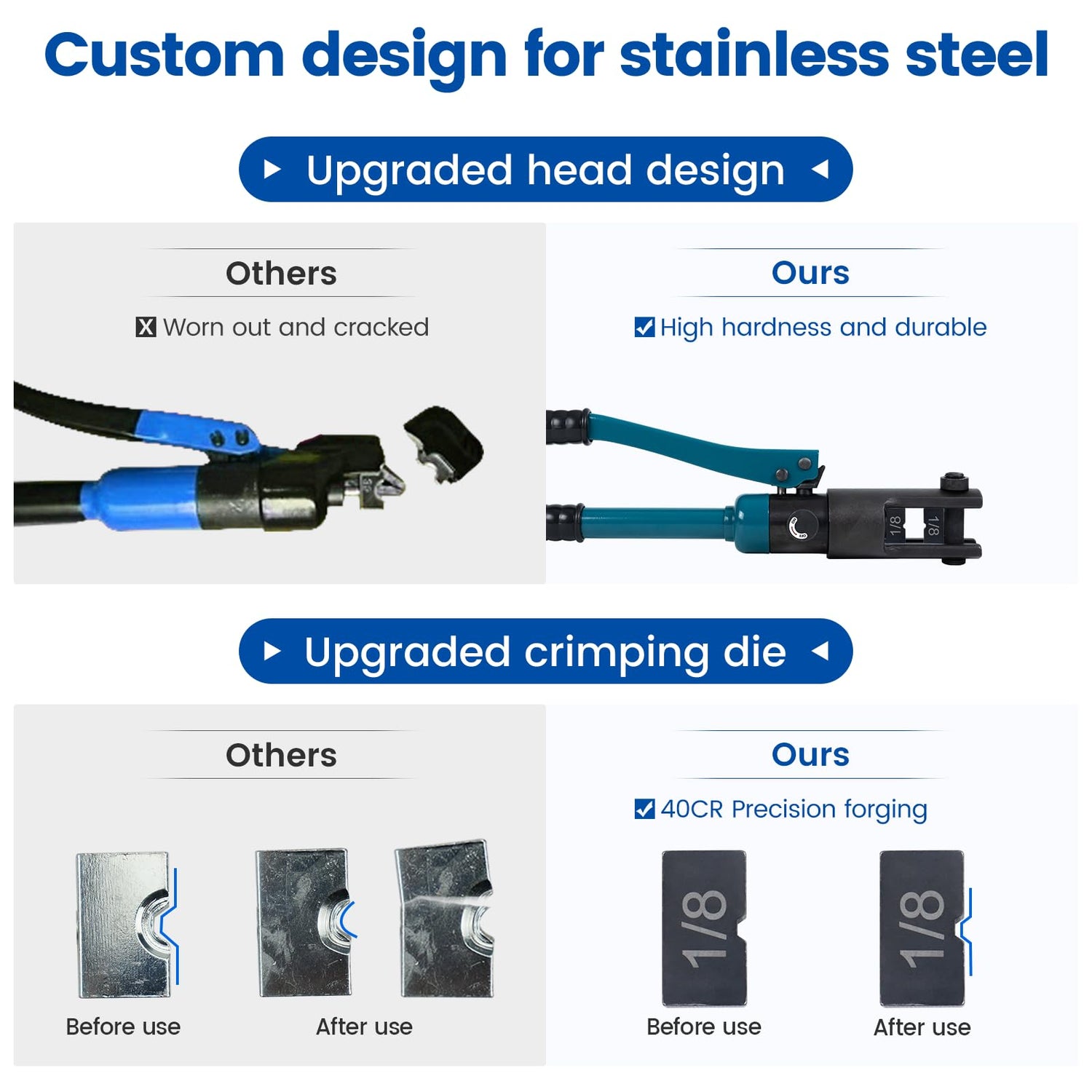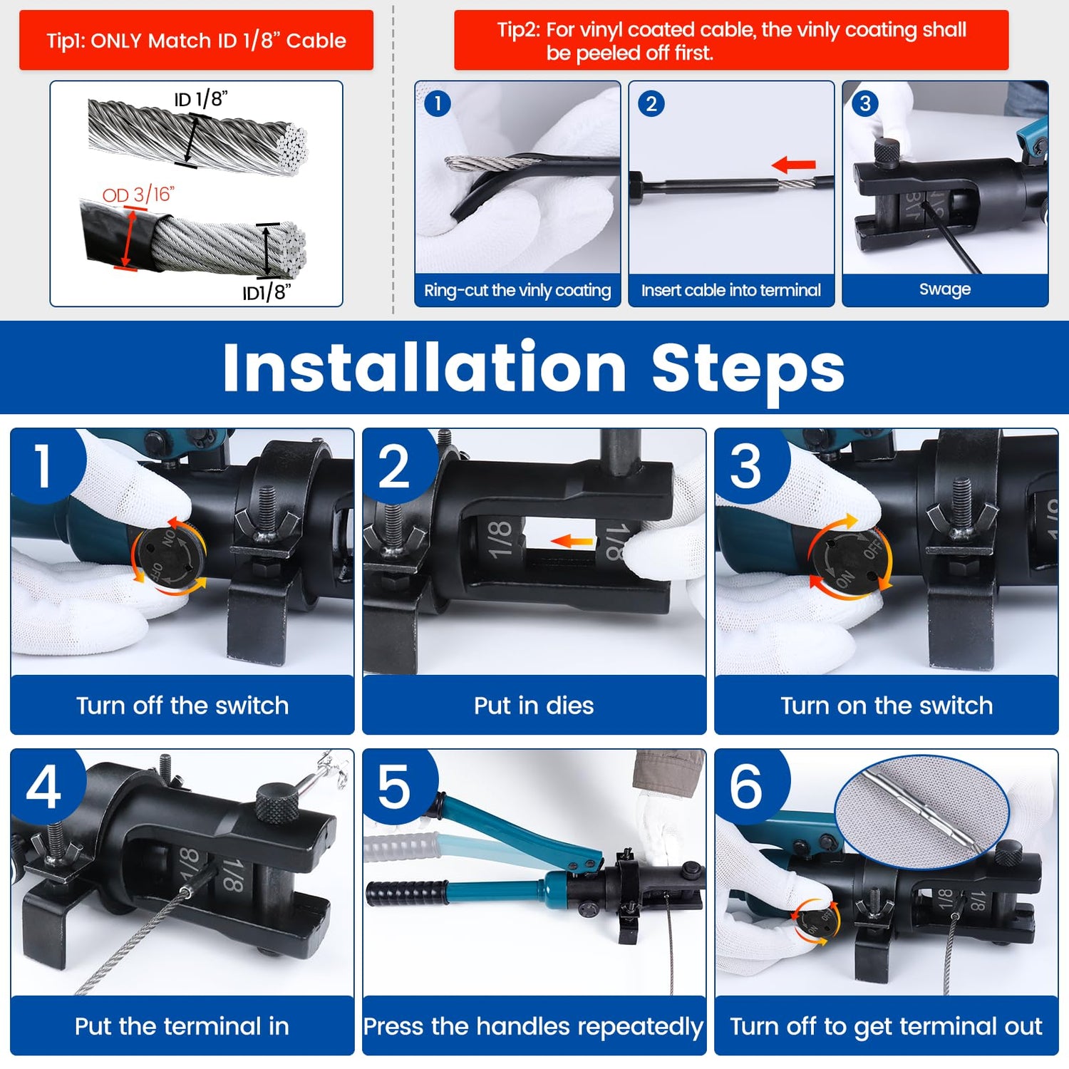 - 【After-Sales Service】 We have upgraded this cable railing crimper to resolve problems like broken head or leaking oil after repeated crimping. If you encounter any of these situations, please do reach out to us. Our after-sales service is available 24/7 for your convenience, and we offer a 30-day return or exchange policy. NOTICE: If you are getting SWAGELESS cable railing kits, there would be no need to use a hydraulic hand crimper