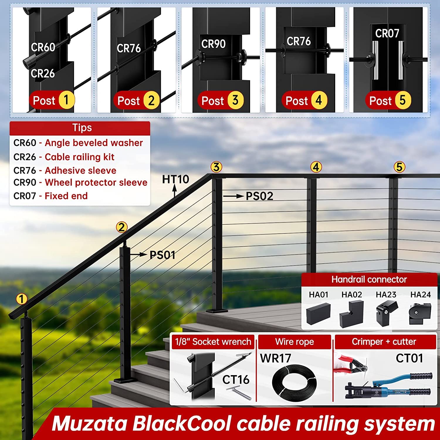 - 【Advice for constructing a system】 To help you build a BlackCool System, we recommend the following product combinations from Muzata, including black posts PS01 PS02 PS32, black handrails HT10, cable railing kits CR26 CR07, protector sleeves CR90 CR67, angled washer CR60, stainless steel cable WR17, hydraulic crimper cutter set CT01, socket wrench CT16, handrail connnector(HA01 HA02 HA23 HA24)