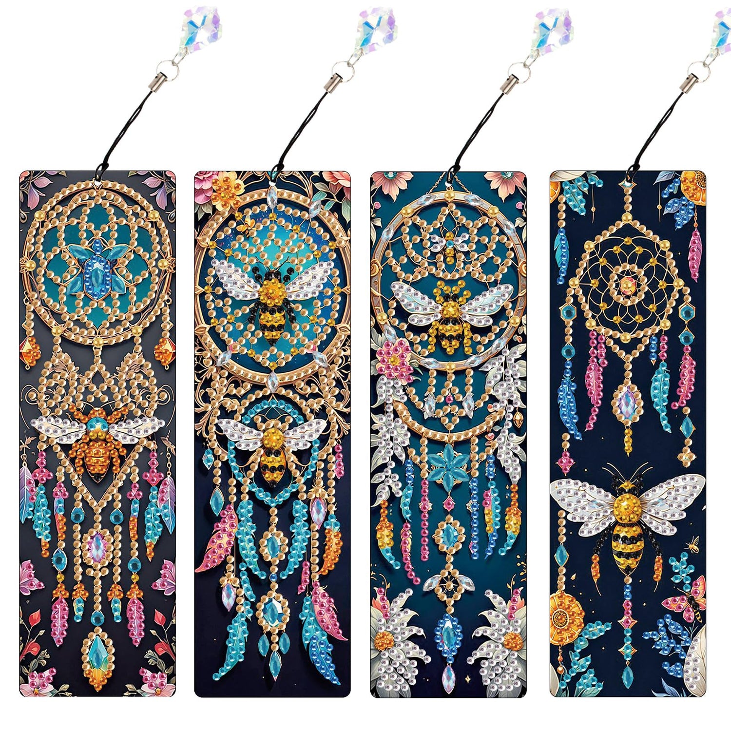MVVMTOP 4pcs 5D Diamond Art Painting Bookmarks with Crystal Pendant, DIY Dreamcatcher & Bees, Pecial Shape Crystal Diamond Partial Art Bookmarks for Book Lovers