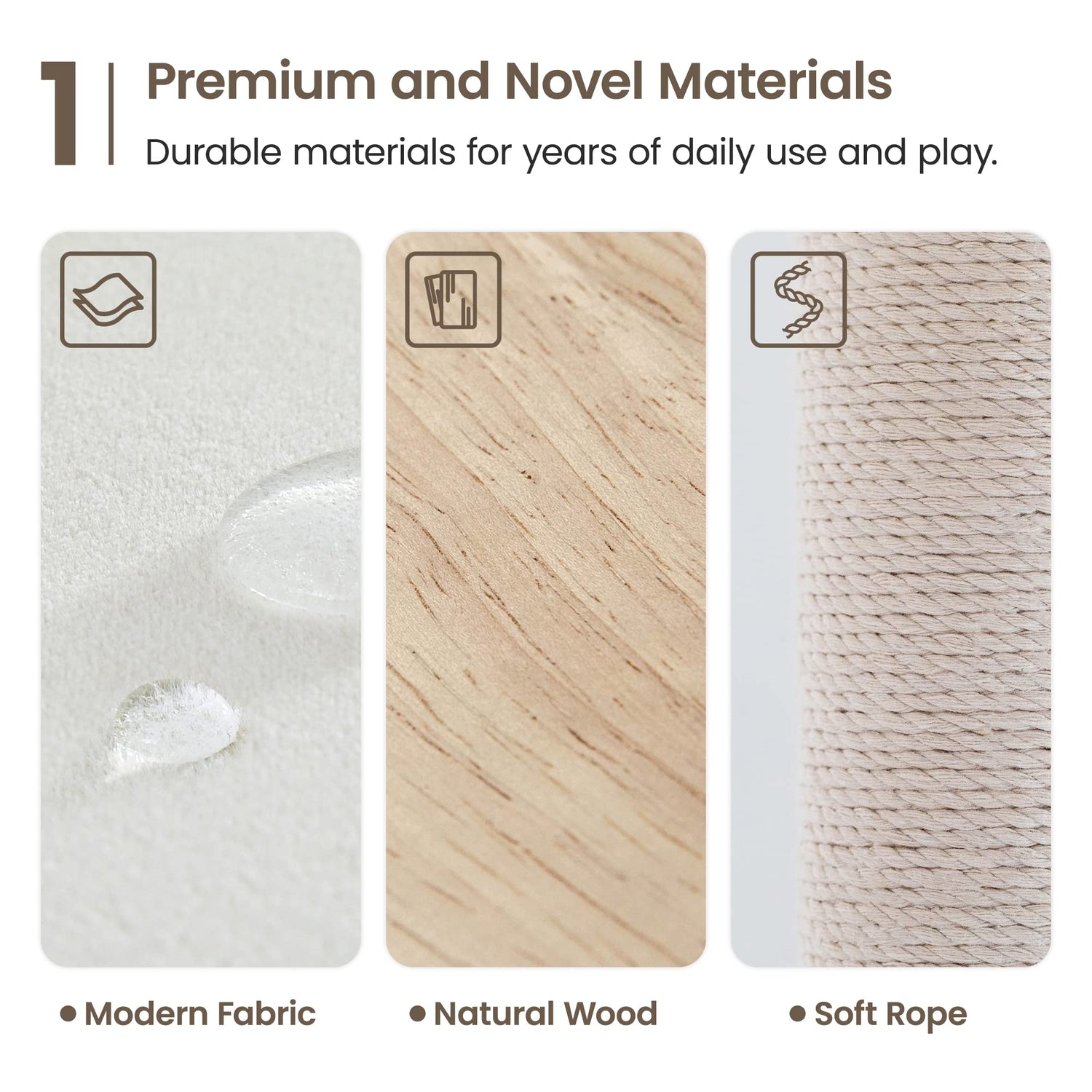 - [Premium and Novel Materials] - This aesthetic cat tree features different materials that set it apart from normal cat trees. Sturdy natural wood adds a touch of elegance to your home decor. Polyester fabric is soft to the touch and easy to clean. Cotton rope is more scratch resistant and kinder to your cat's claws.