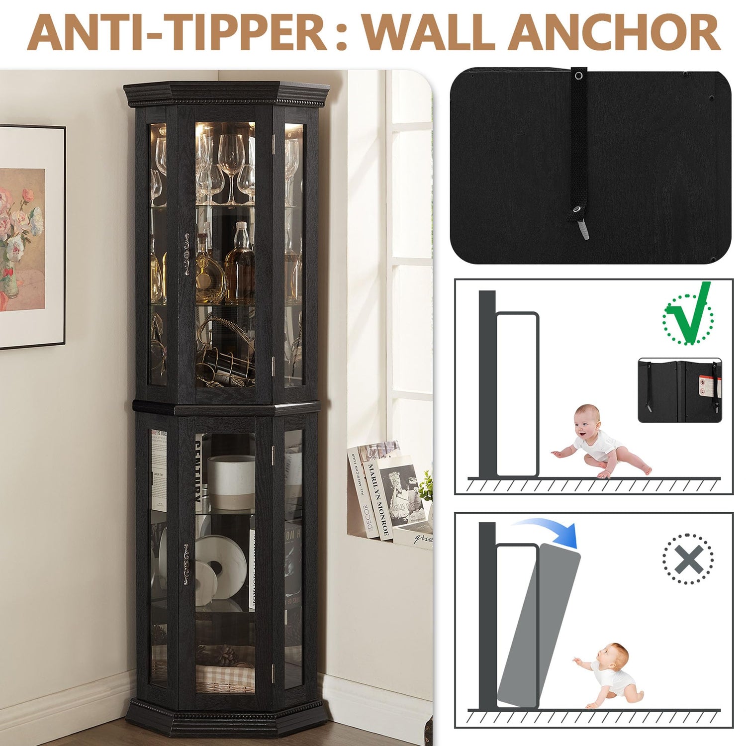 - Easy Tool-Free Assembly: Set up your corner display cabinet with glass doors in time; Follow clear step-by-step instructions; Peel off the protective film before assembly for a flawless finish; No tools required for hassle-free setup