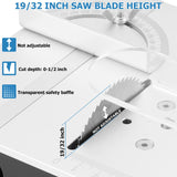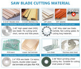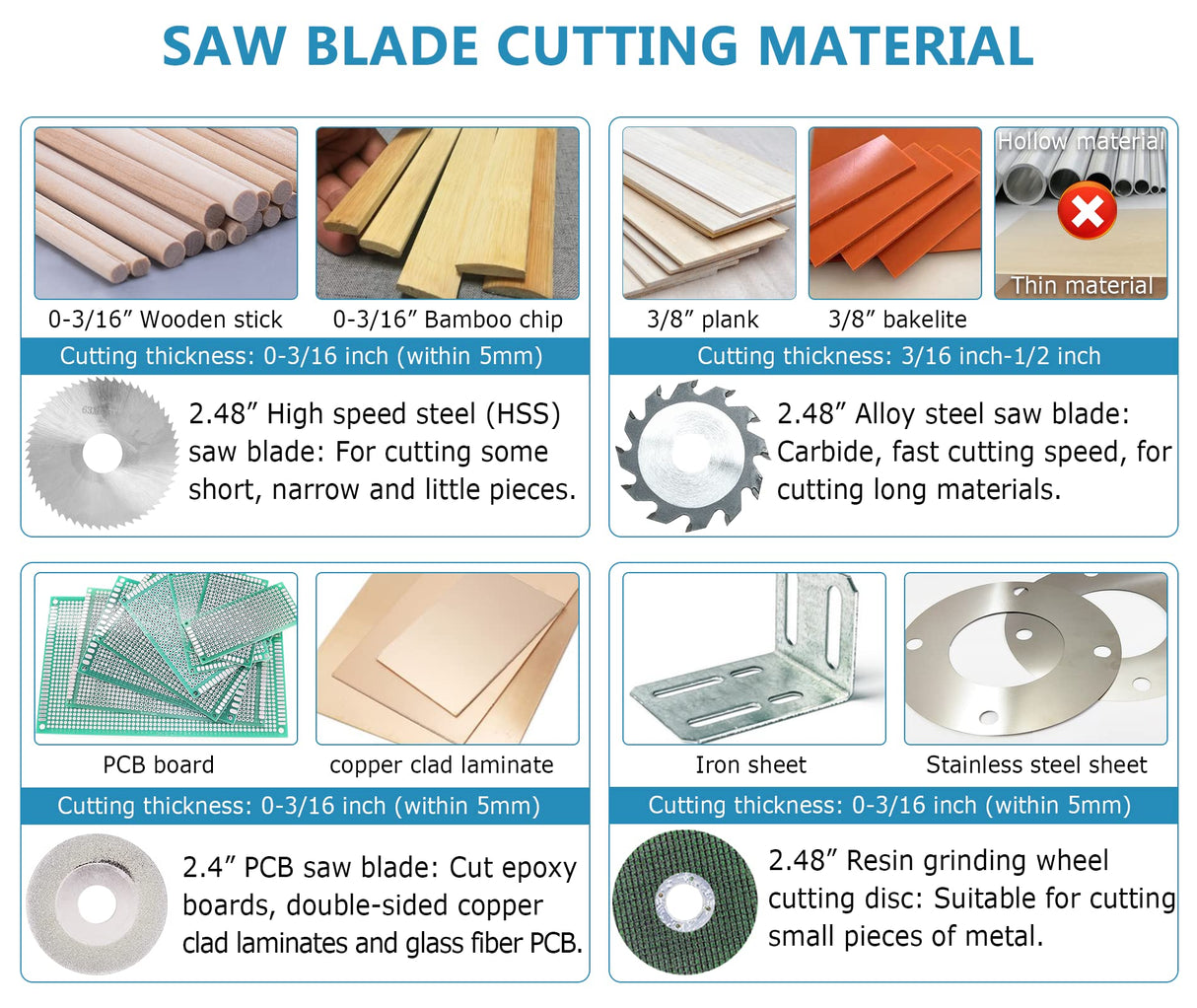 - 【1/2" CUT DEPTH】The distance from the saw blade to the table is 0-0.59 inches. The saw blade height is not adjustable. (If you want to adjust the blade height, please search B0933BRJVL.) And this portable mini craft table saw with a cut depth of 0-1/2 inch. We provide 4 commonly used circular saw blades, which can meet your basic cutting needs!