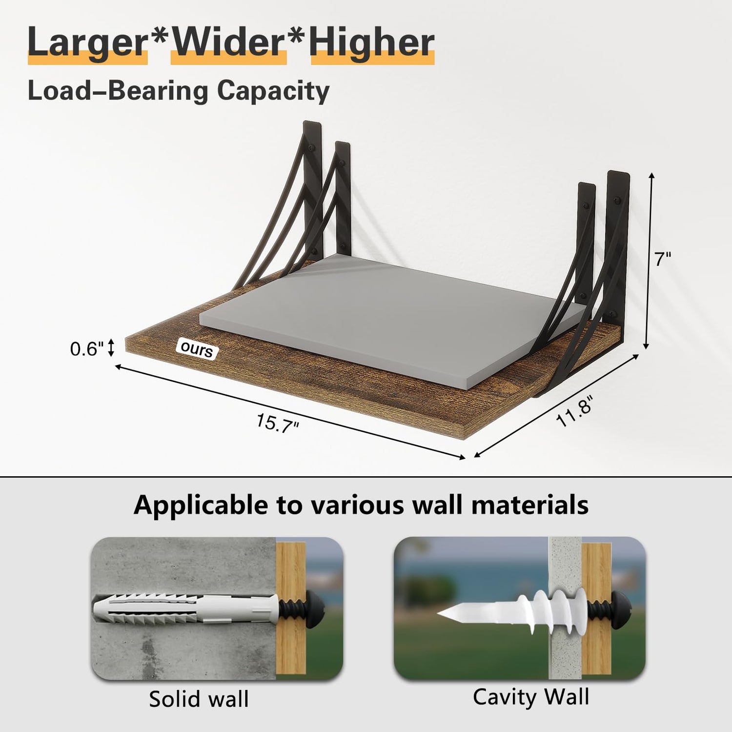 - [Larger and More Spacious]: What makes our wood floating shelves distinctive is the large and wider construction, measuring 15.7 x 11.8-inch, that can fit more books, more picture frames and trinkets, keeping them on an elegant display.