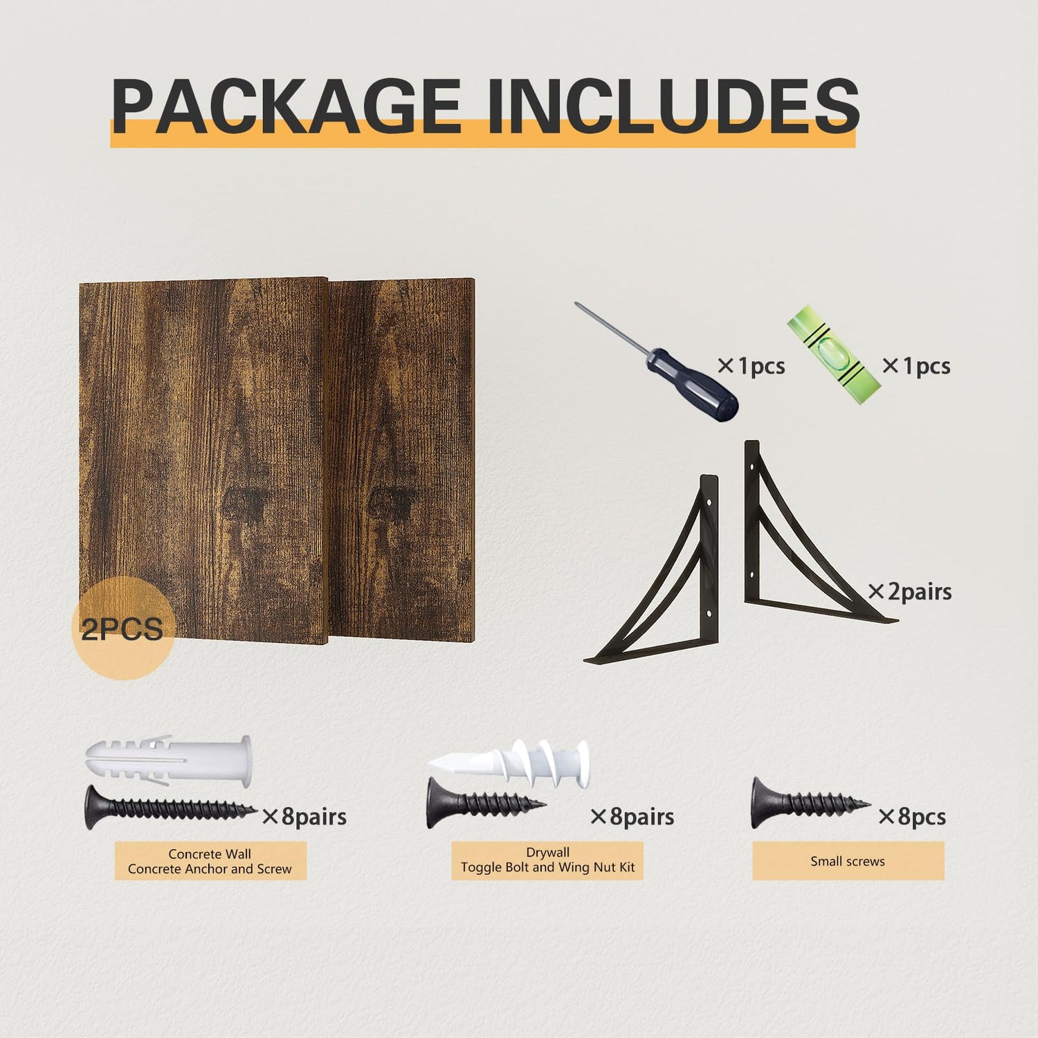 - [Easy-to-install]: The floating wall shelves arrive in a convenient set of 2 with all the hardware included! The set includes 2 x wooden boards, 2 x iron brackets, screws, and installation tools, so you don’t need handymen or special tools to install your shelves within minutes!